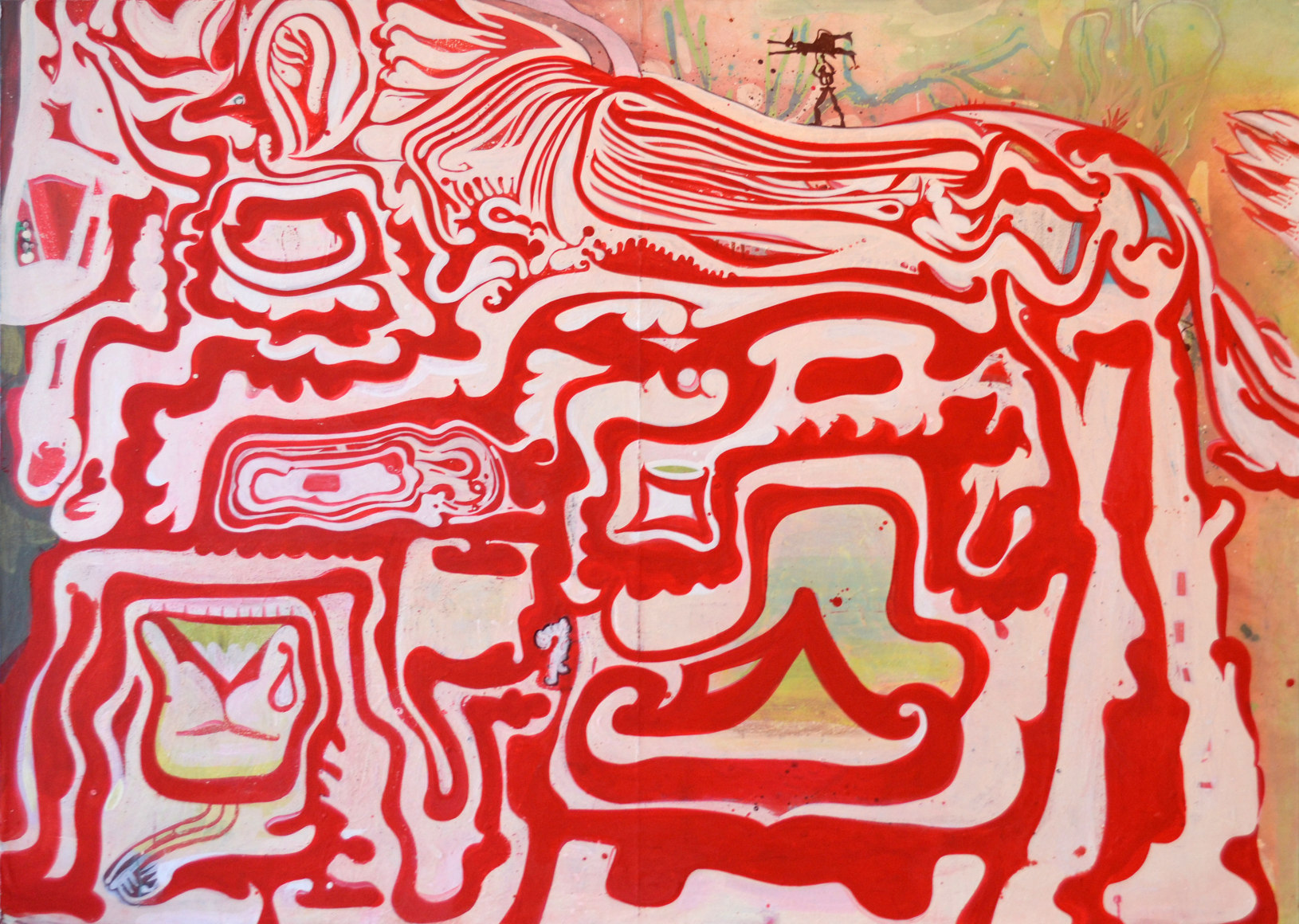 Horvath’s recent paintings represent a very similar albeit homegrown and patch-worked mythology. In the work,