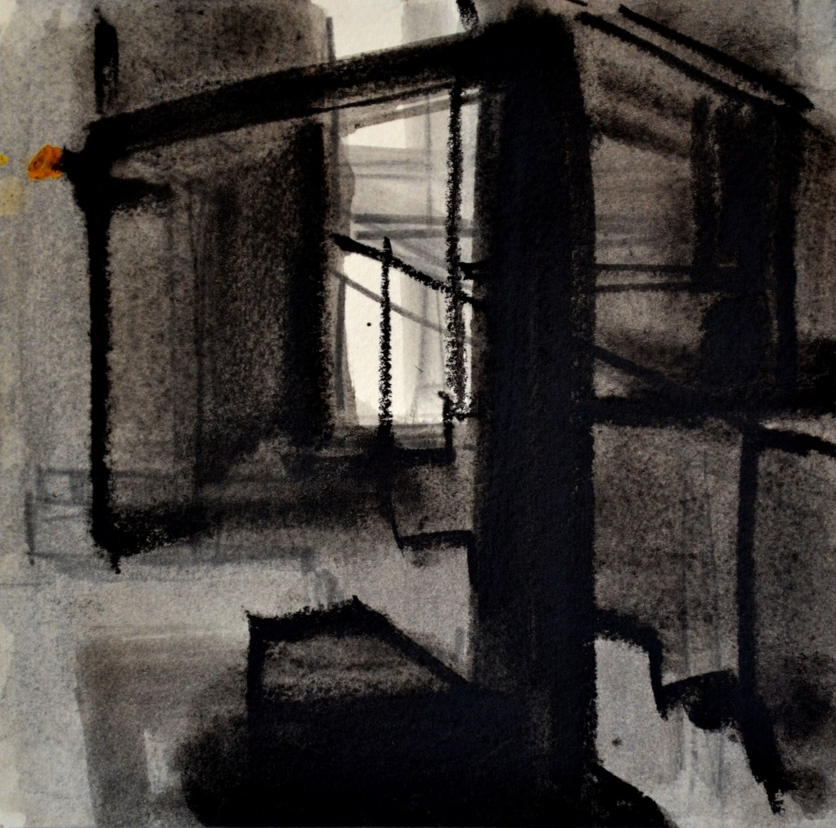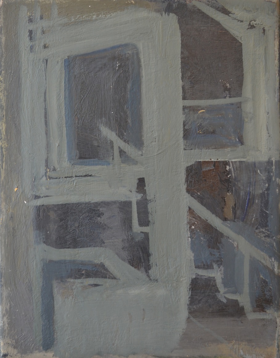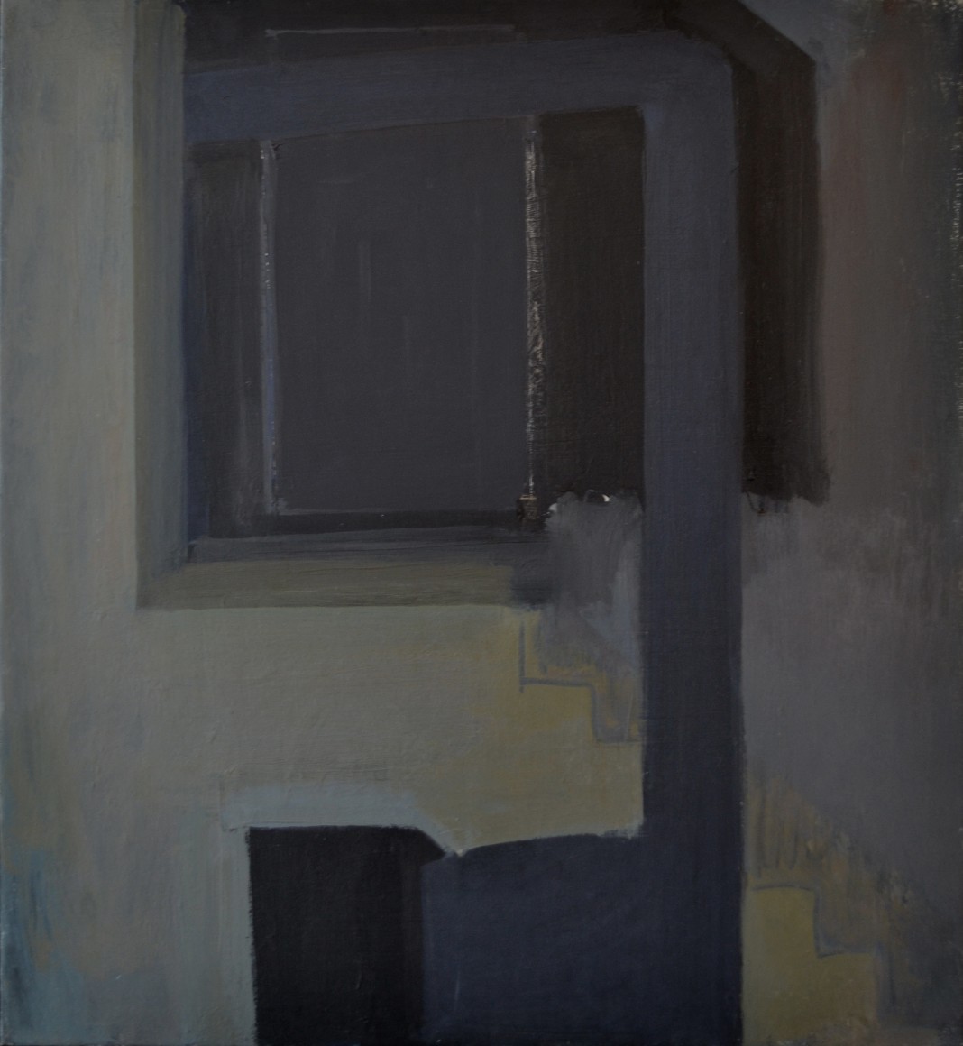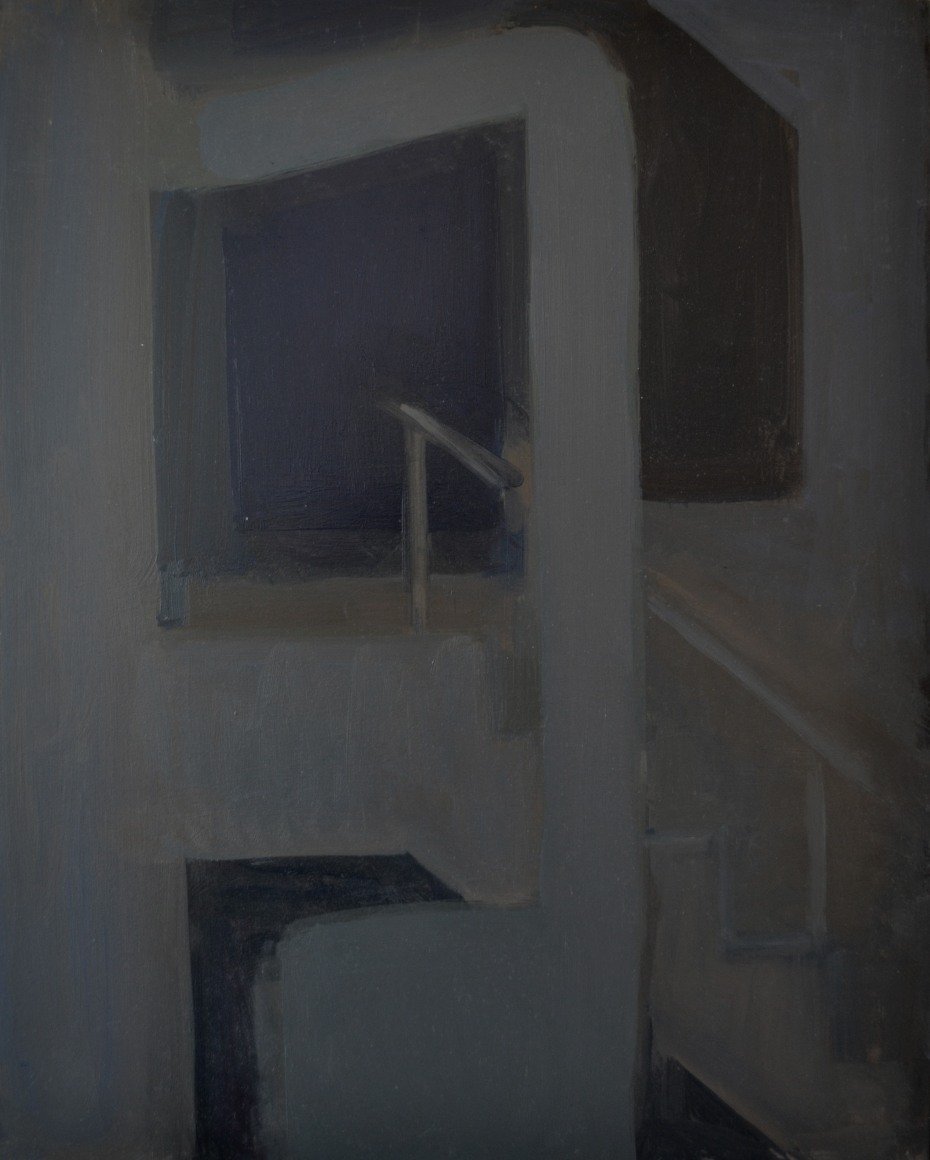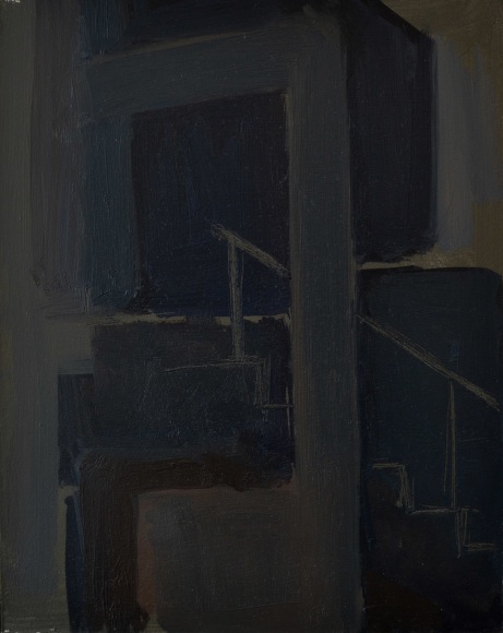 This latest body of work continues the artist's exploration of variations on singular themes. While the artist has continued to paint and draw the landscape that made up her last show, three new motifs have emerged. The first predominant tableaux is an interior scene of a shadowy basement. Articulated in dark, squared geometries, the otherwise abstract composition is identified only by a stovepipe and a flight of stairs bisecting the picture plane. These stairs lead to what is presumably a door to the ground floor, illuminated by a halo of light shining through the doorframe.