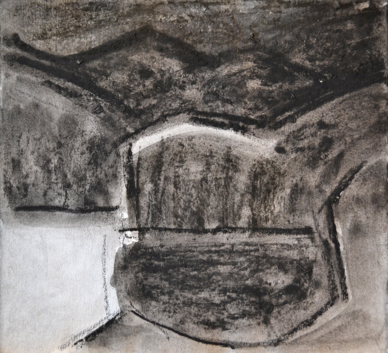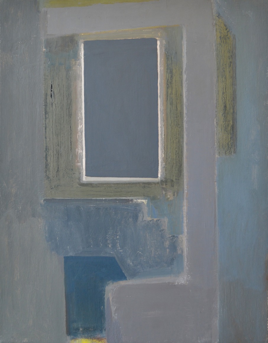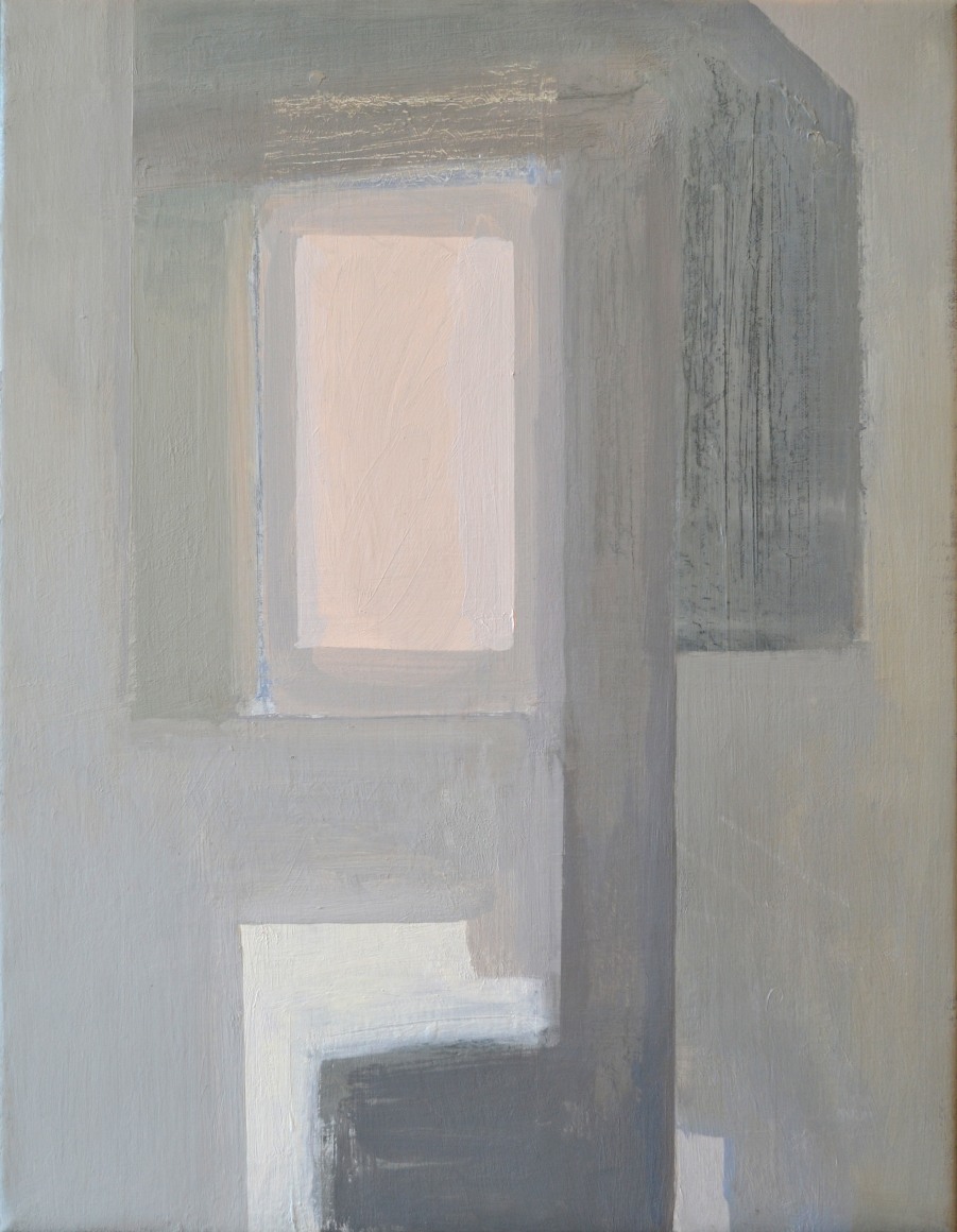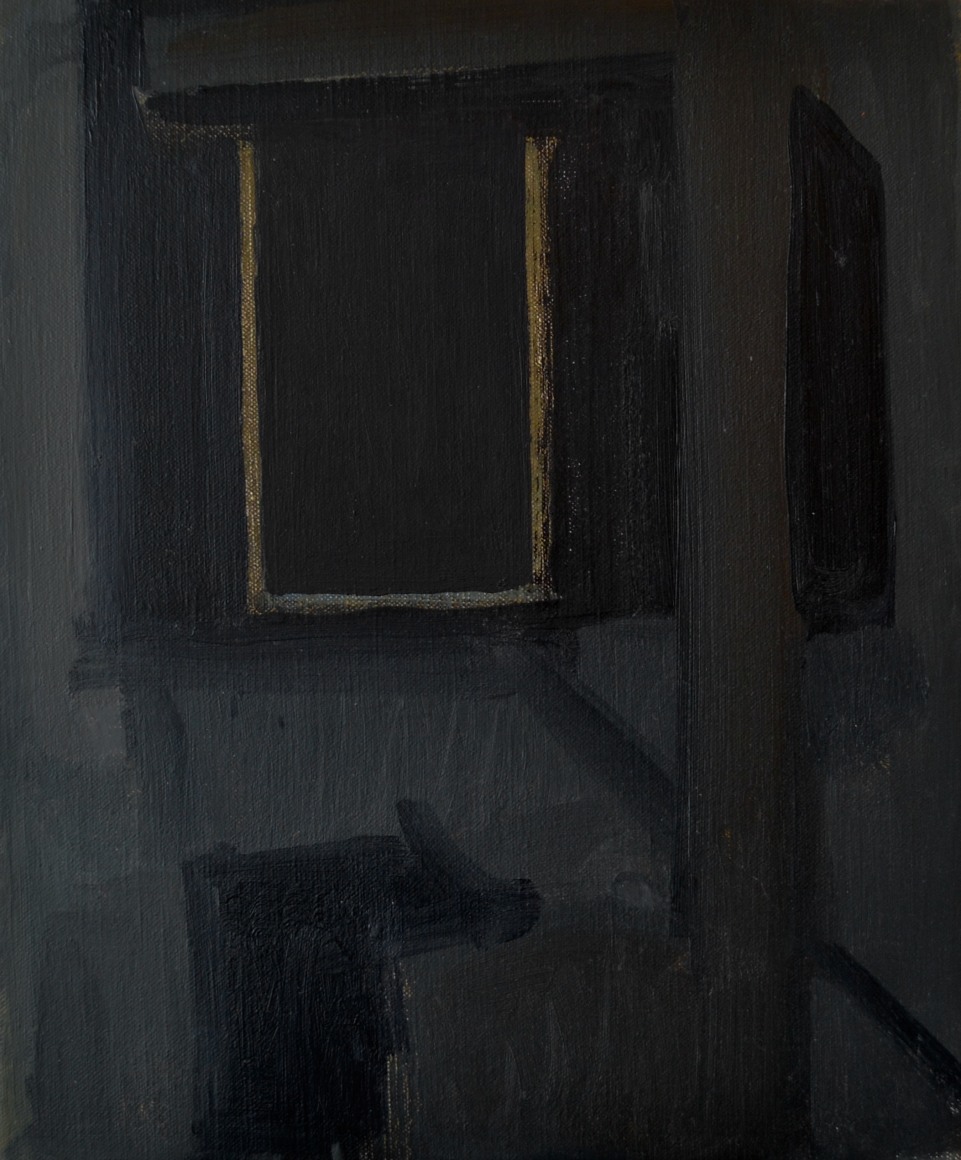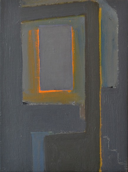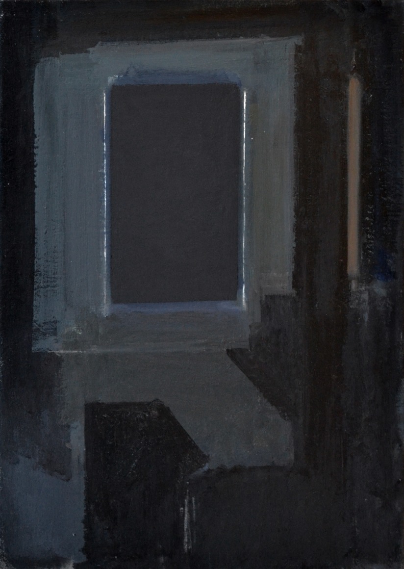 This latest body of work continues the artist's exploration of variations on singular themes. While the artist has continued to paint and draw the landscape that made up her last show, three new motifs have emerged. The first predominant tableaux is an interior scene of a shadowy basement. Articulated in dark, squared geometries, the otherwise abstract composition is identified only by a stovepipe and a flight of stairs bisecting the picture plane. These stairs lead to what is presumably a door to the ground floor, illuminated by a halo of light shining through the doorframe.