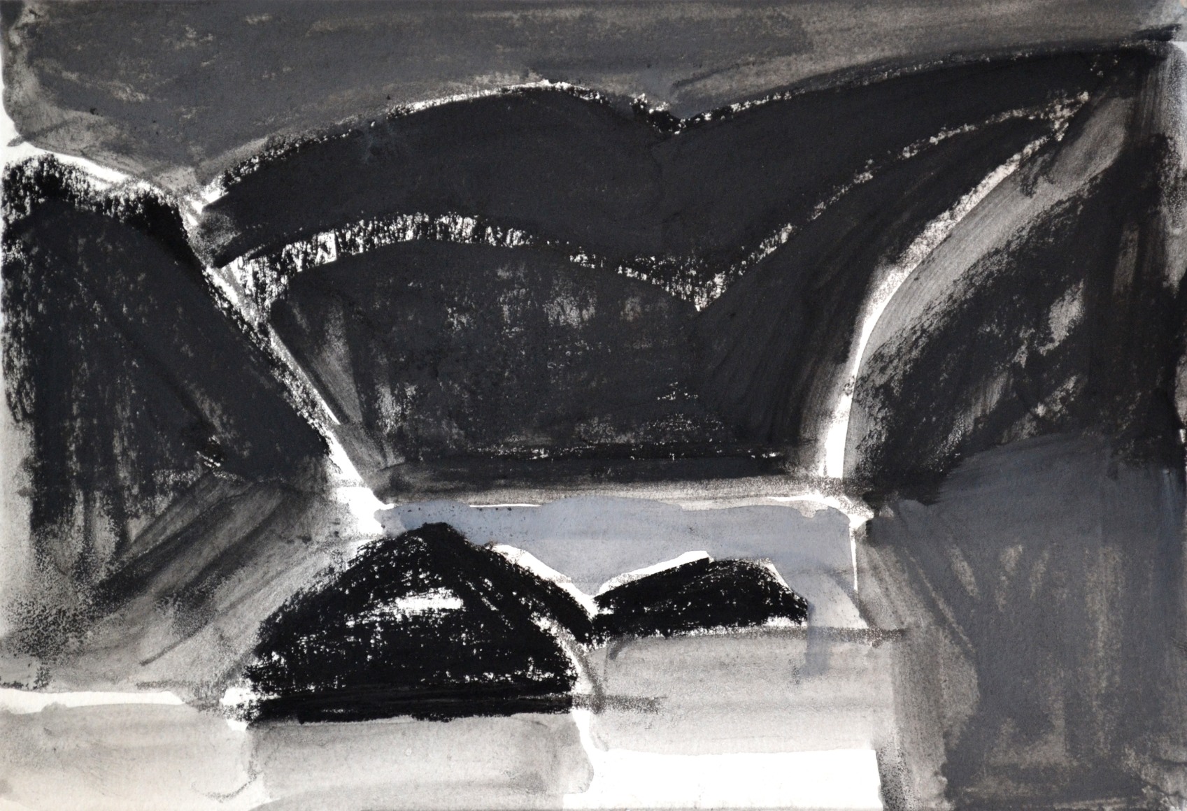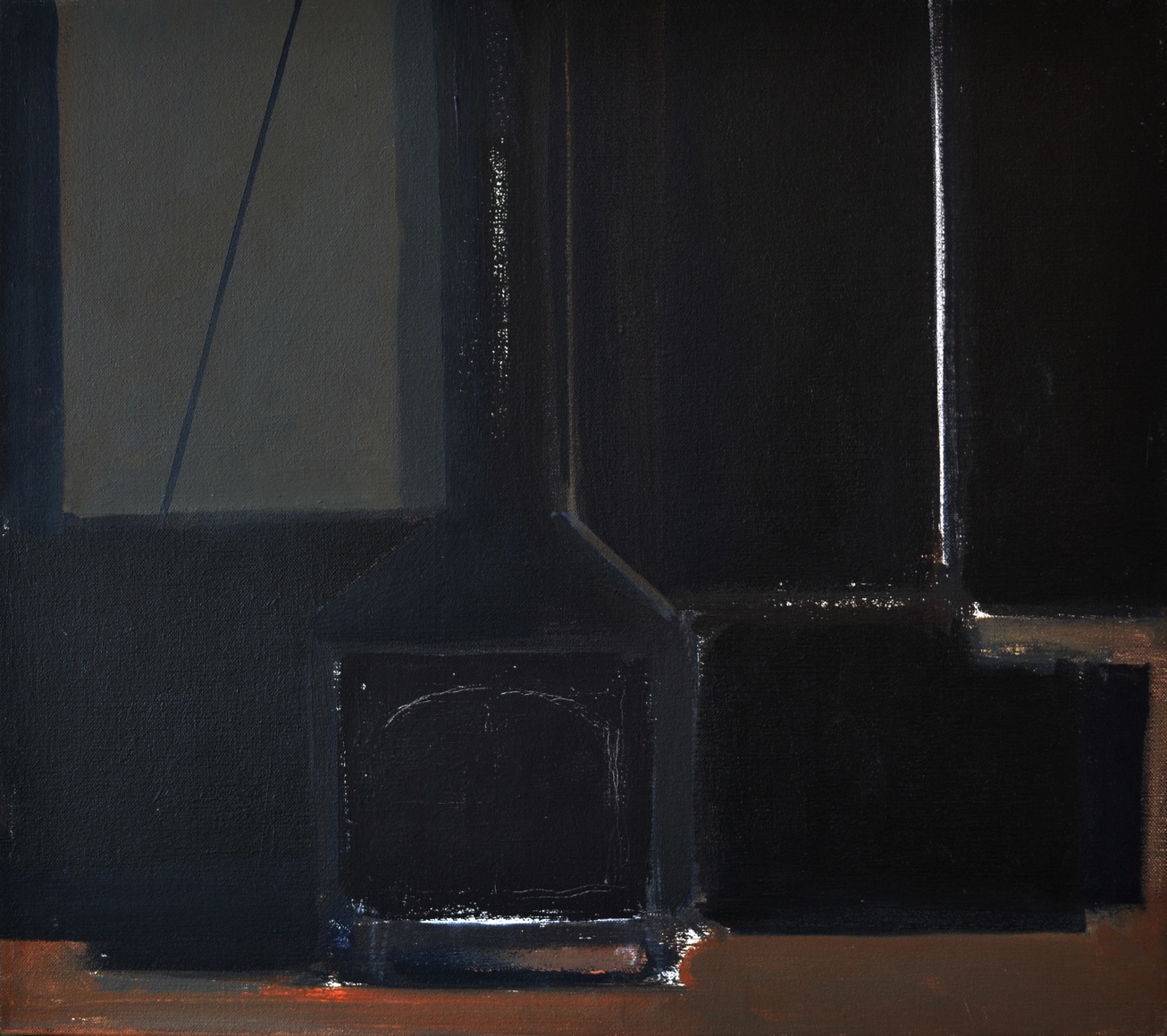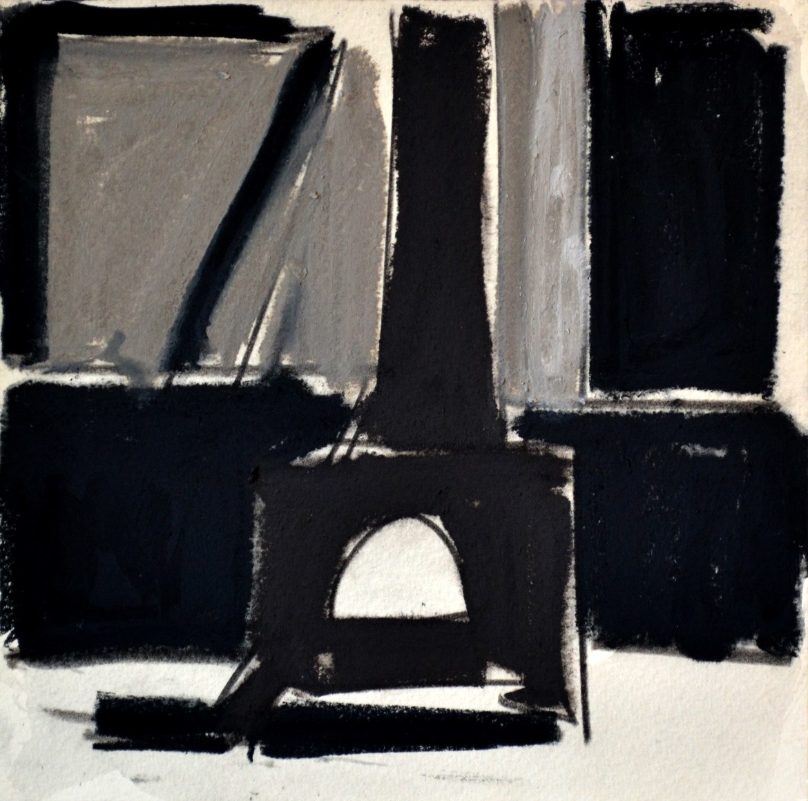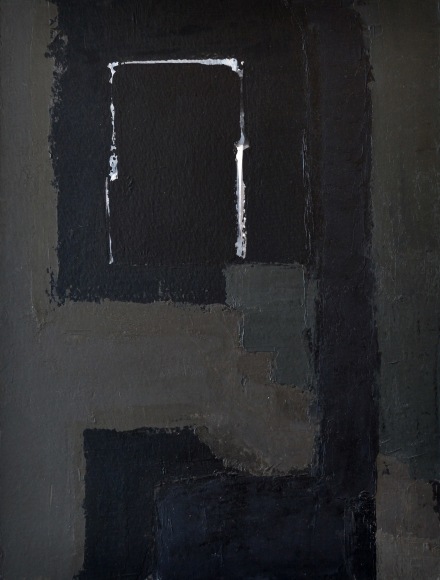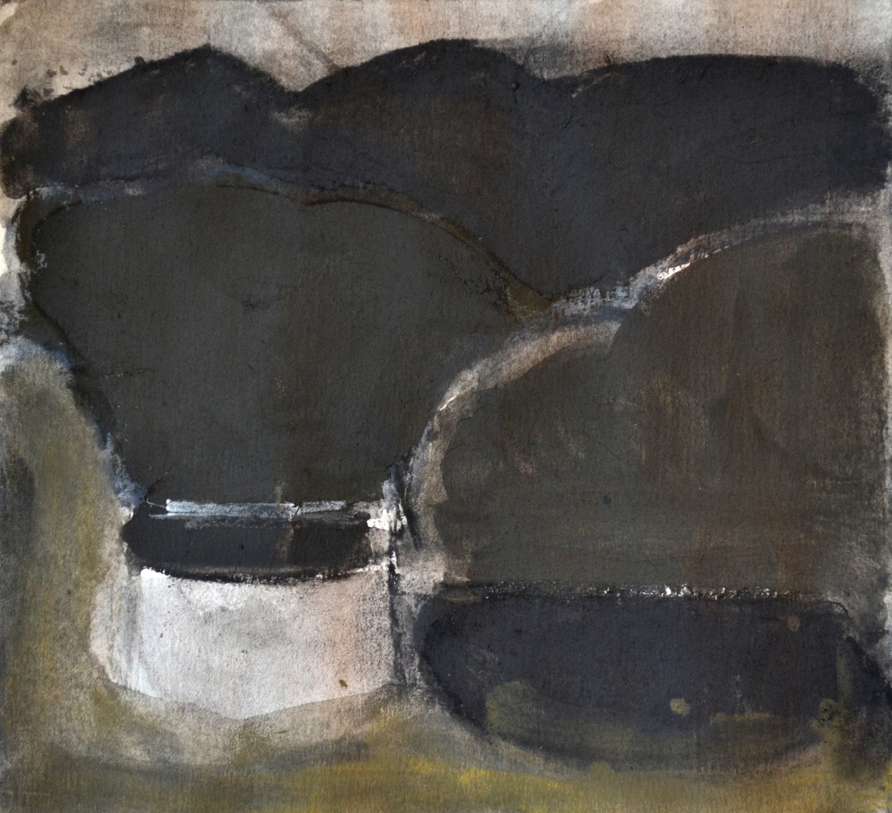 This latest body of work continues the artist's exploration of variations on singular themes. While the artist has continued to paint and draw the landscape that made up her last show, three new motifs have emerged. The first predominant tableaux is an interior scene of a shadowy basement. Articulated in dark, squared geometries, the otherwise abstract composition is identified only by a stovepipe and a flight of stairs bisecting the picture plane. These stairs lead to what is presumably a door to the ground floor, illuminated by a halo of light shining through the doorframe.