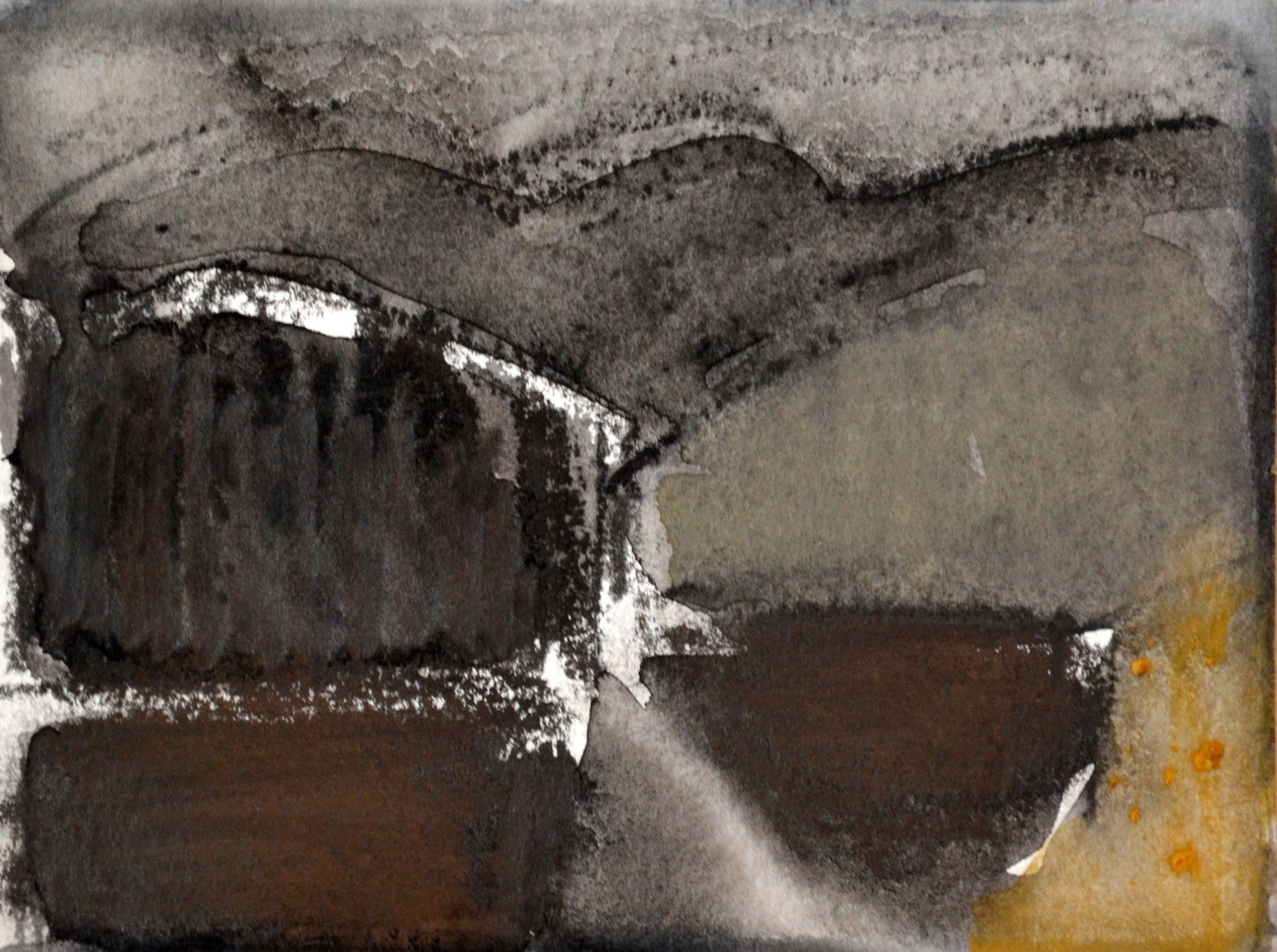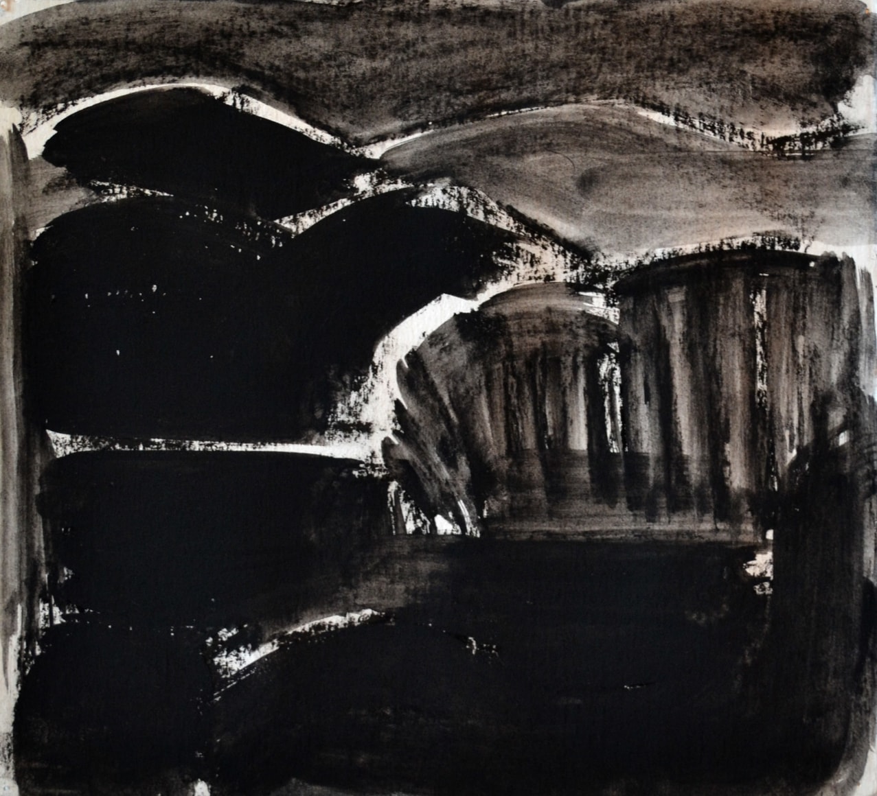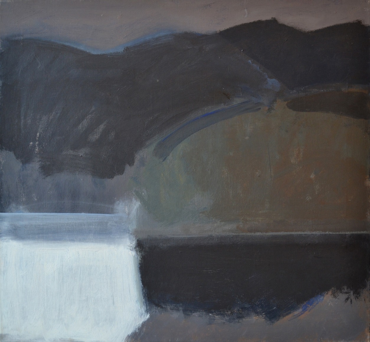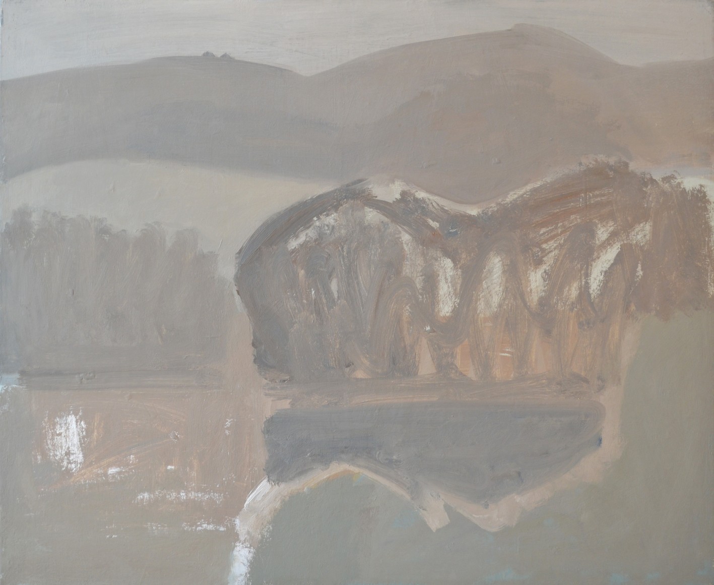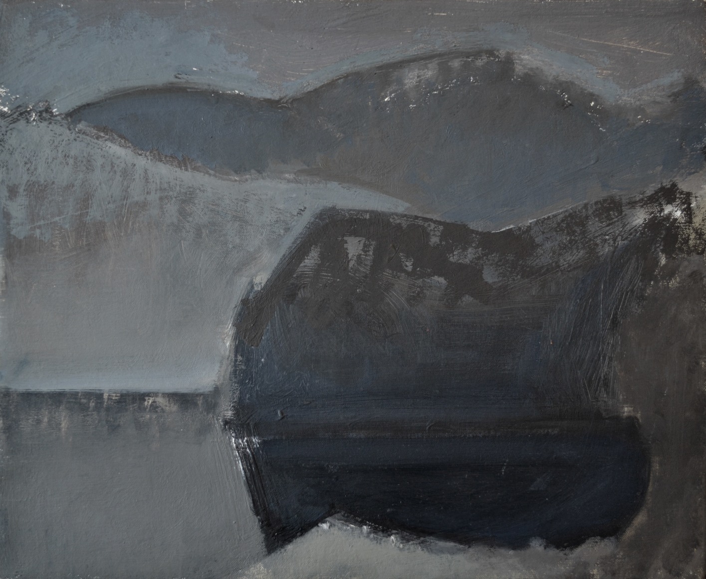 This latest body of work continues the artist's exploration of variations on singular themes. While the artist has continued to paint and draw the landscape that made up her last show, three new motifs have emerged. The first predominant tableaux is an interior scene of a shadowy basement. Articulated in dark, squared geometries, the otherwise abstract composition is identified only by a stovepipe and a flight of stairs bisecting the picture plane. These stairs lead to what is presumably a door to the ground floor, illuminated by a halo of light shining through the doorframe.