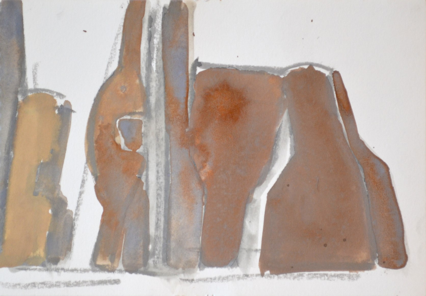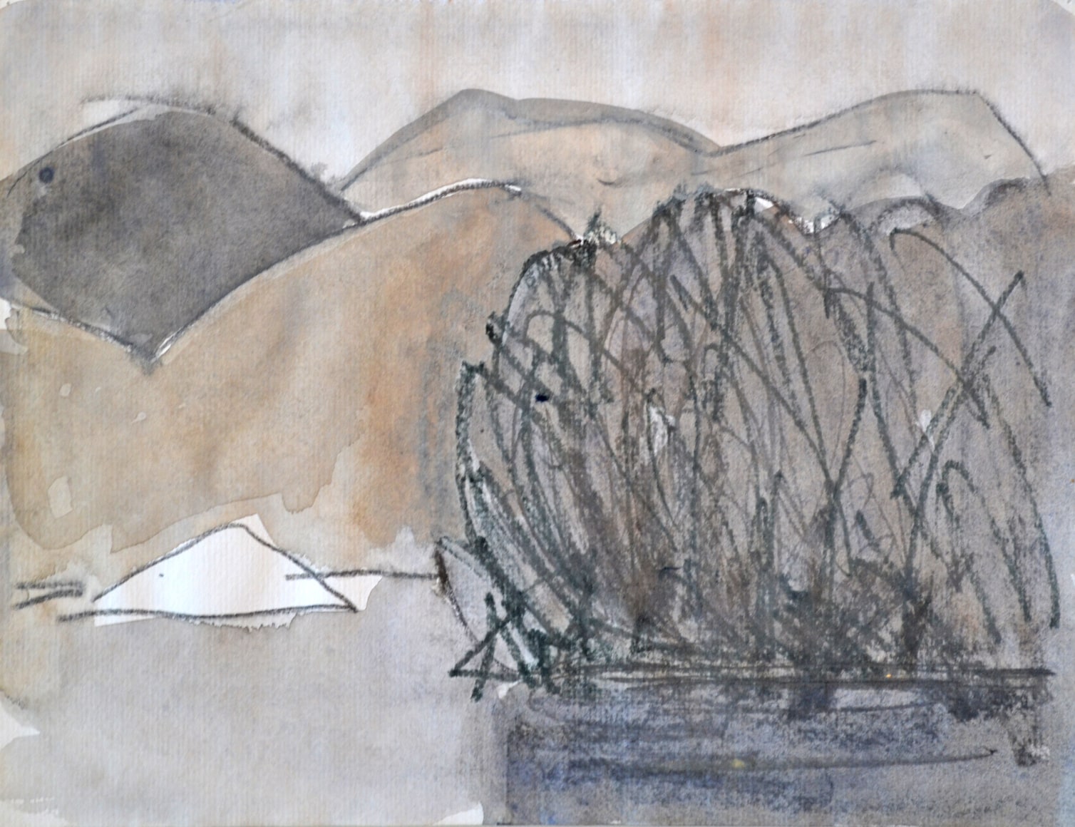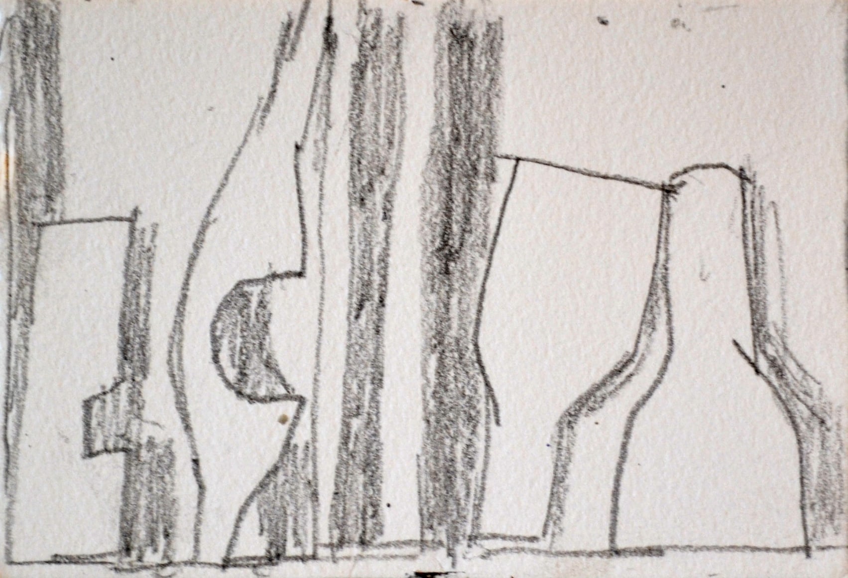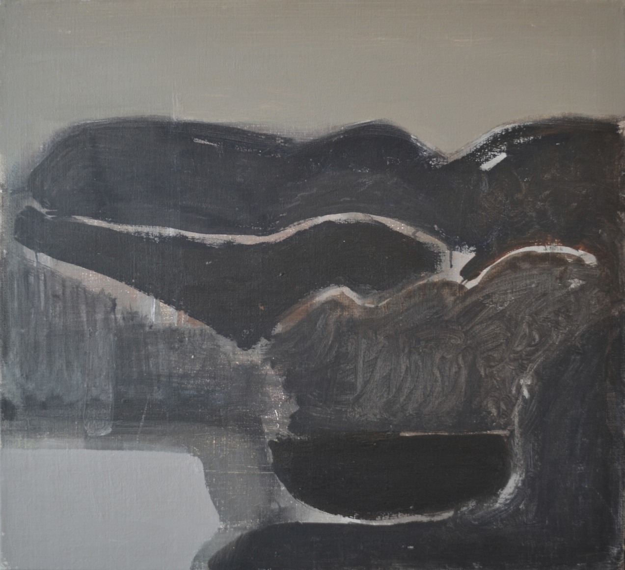 This latest body of work continues the artist's exploration of variations on singular themes. While the artist has continued to paint and draw the landscape that made up her last show, three new motifs have emerged. The first predominant tableaux is an interior scene of a shadowy basement. Articulated in dark, squared geometries, the otherwise abstract composition is identified only by a stovepipe and a flight of stairs bisecting the picture plane. These stairs lead to what is presumably a door to the ground floor, illuminated by a halo of light shining through the doorframe.