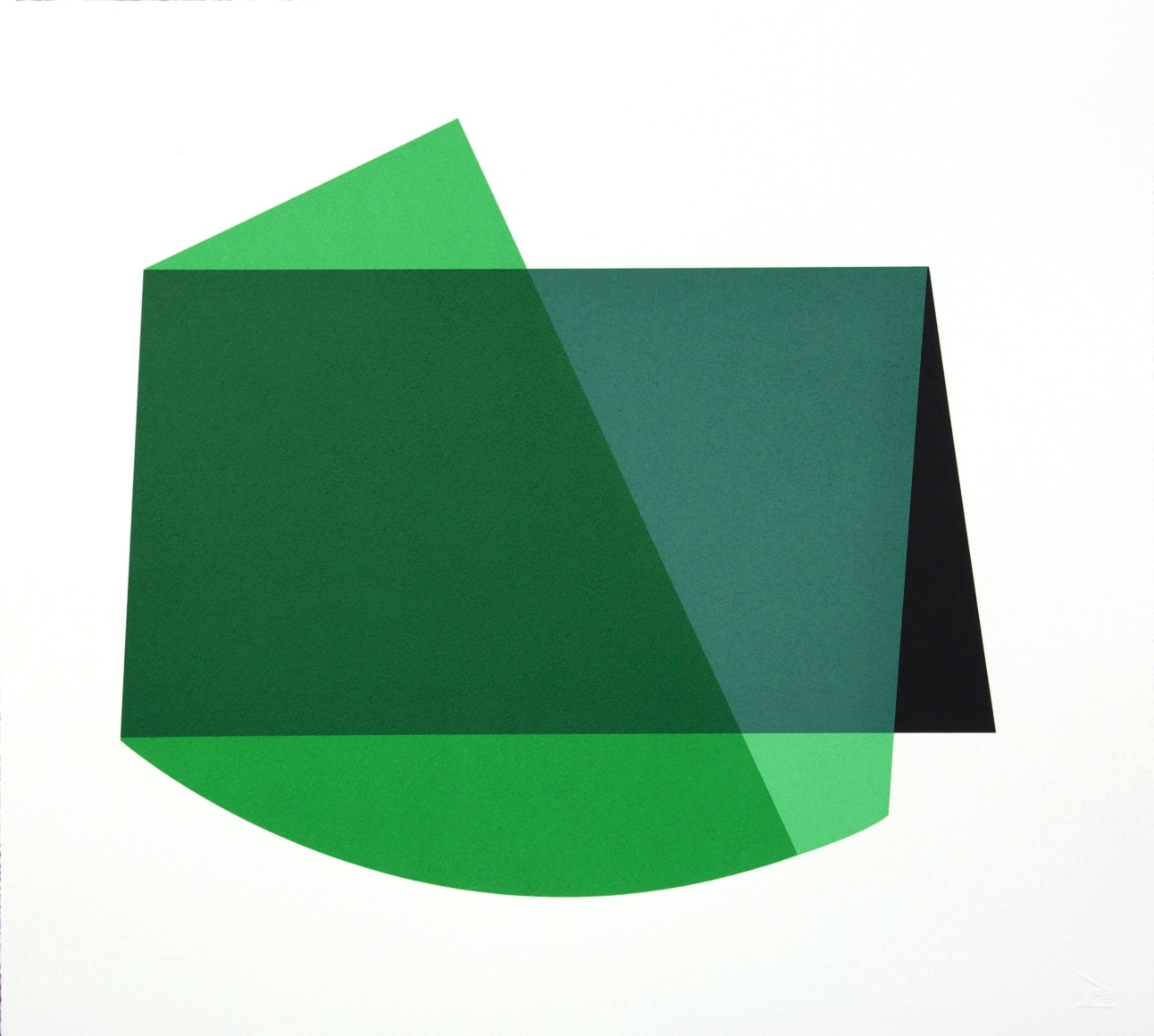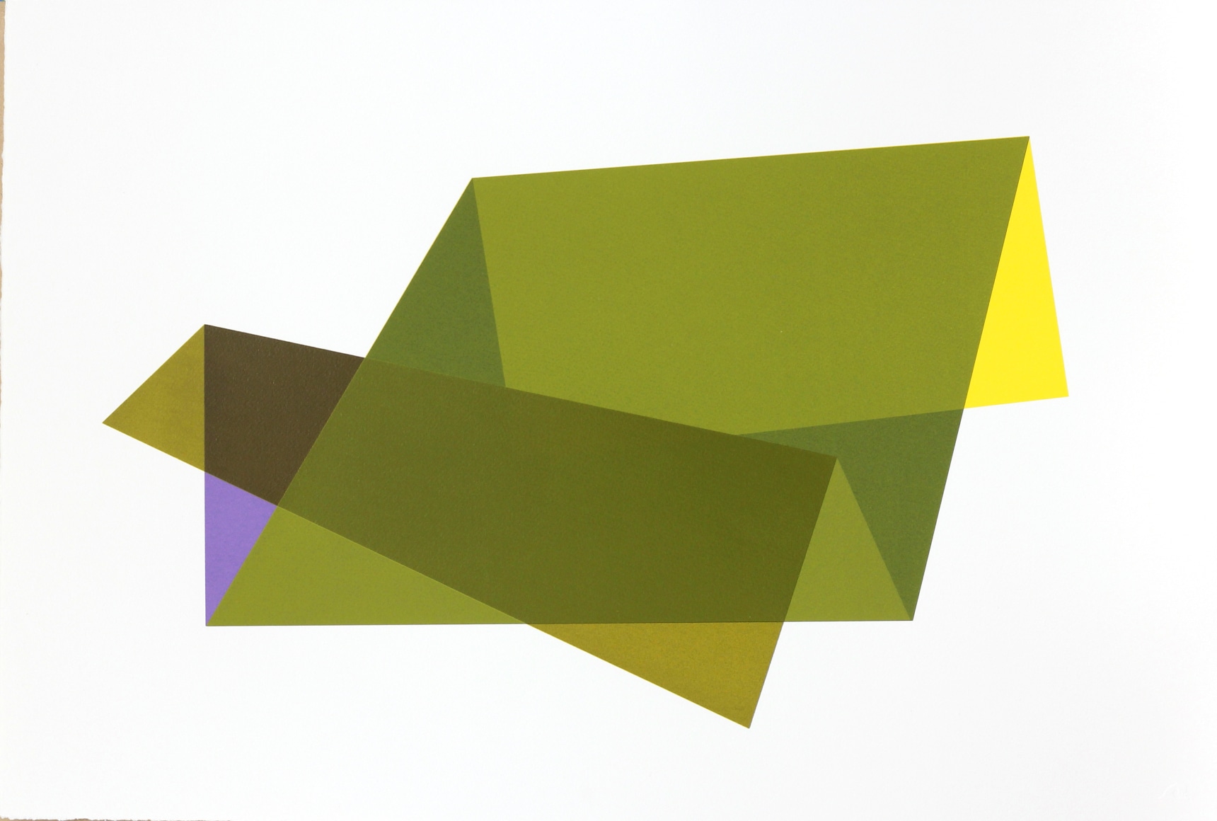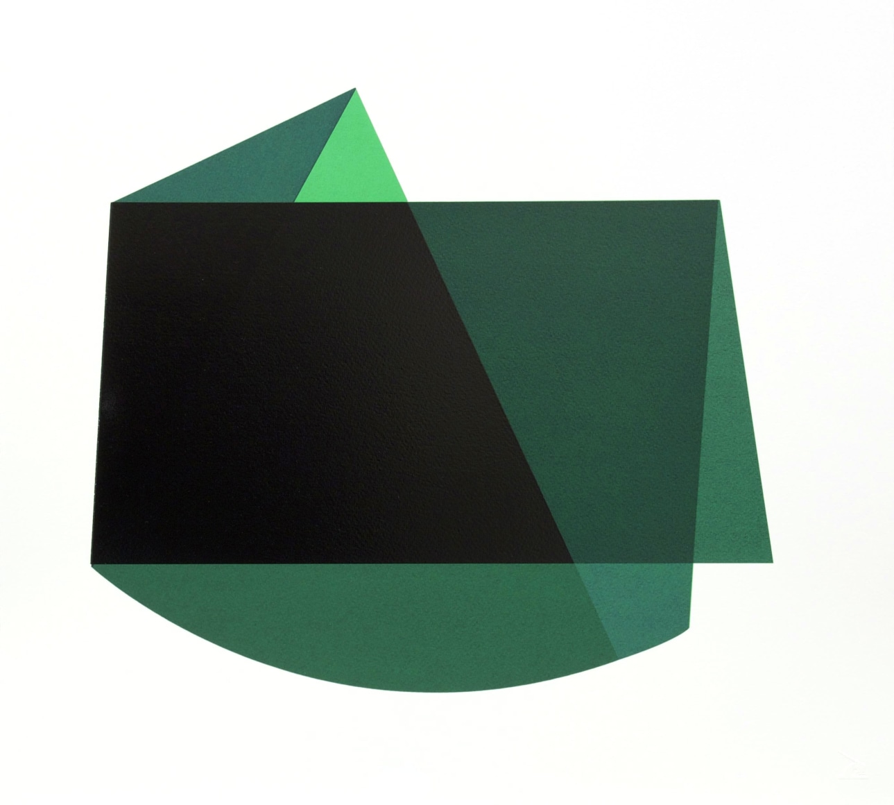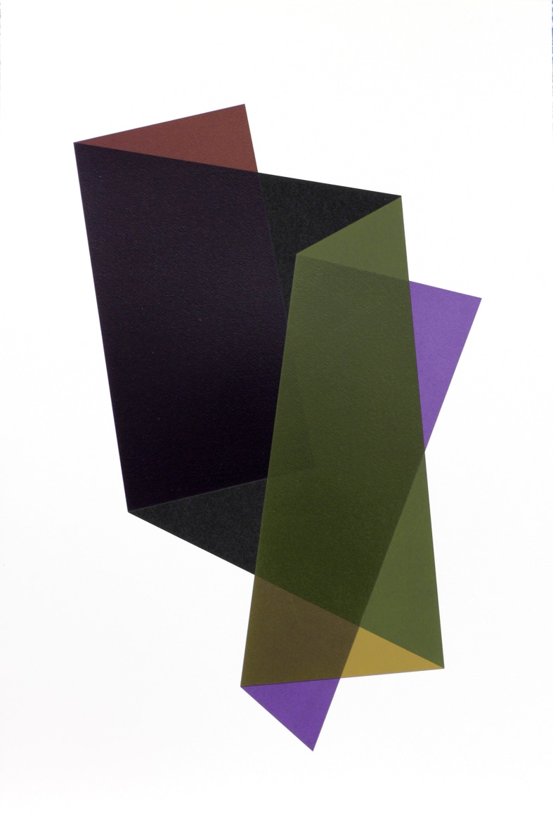 Boepple’s first monoprints, made with the master printer Kip Gresham in Cambridge, England were originally inspired by the artist’s resin sculptures. Layered shapes derived directly from the sculpture explored themes of layering and translucency. Over the last two years, Boepple’s imagery evolved into forms that fold over themselves, layering on one another, almost like origami. This theme developed a number of different formats that invite the viewer to draw associations to quotidian objects such as Band-Aids, envelopes, and tents.