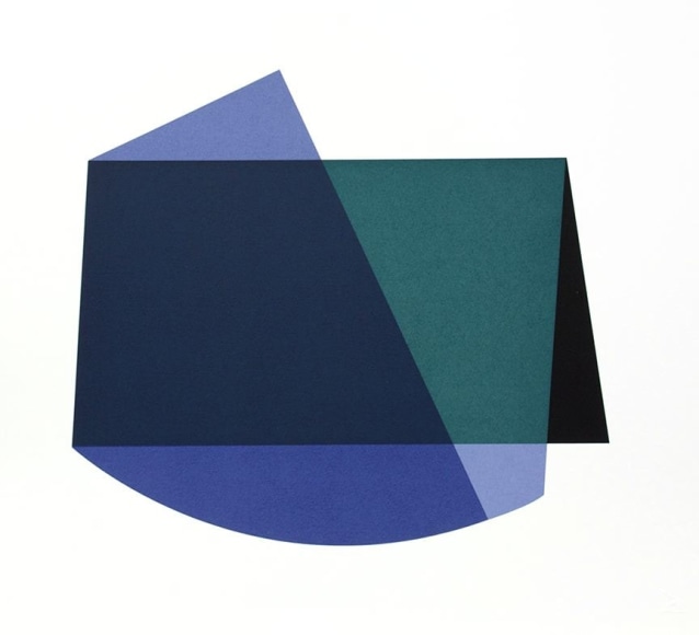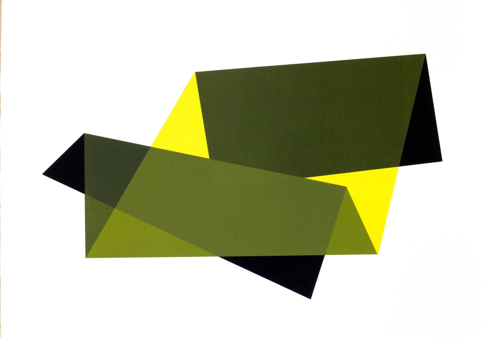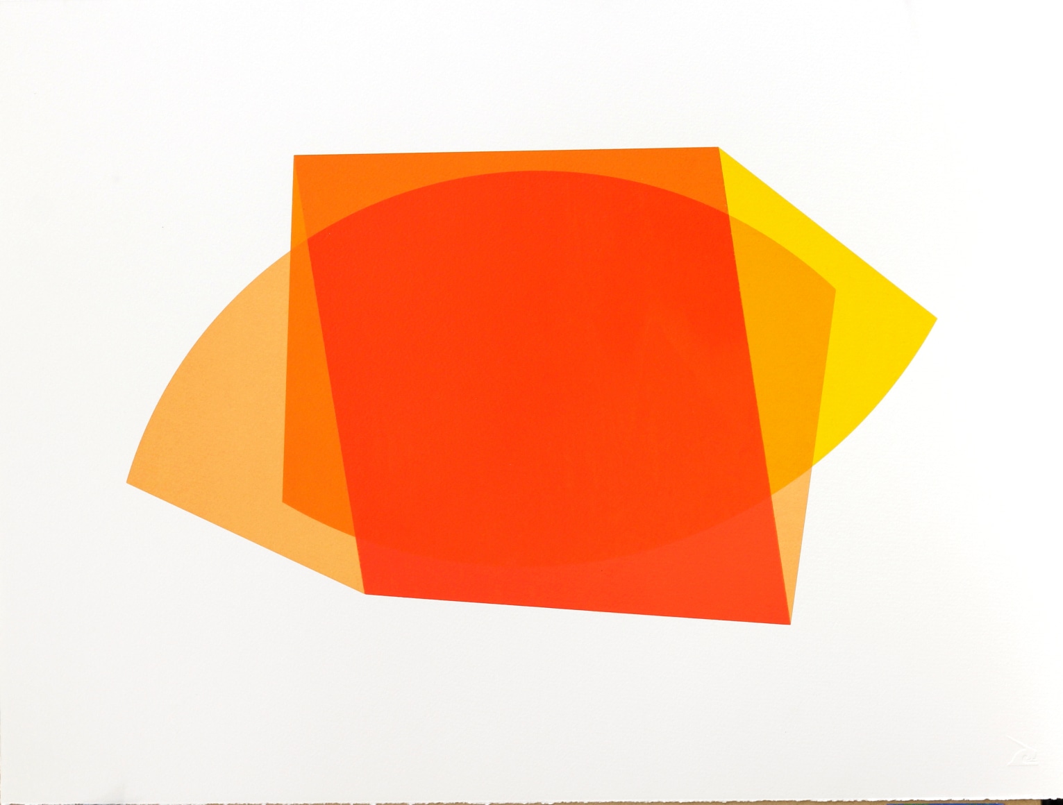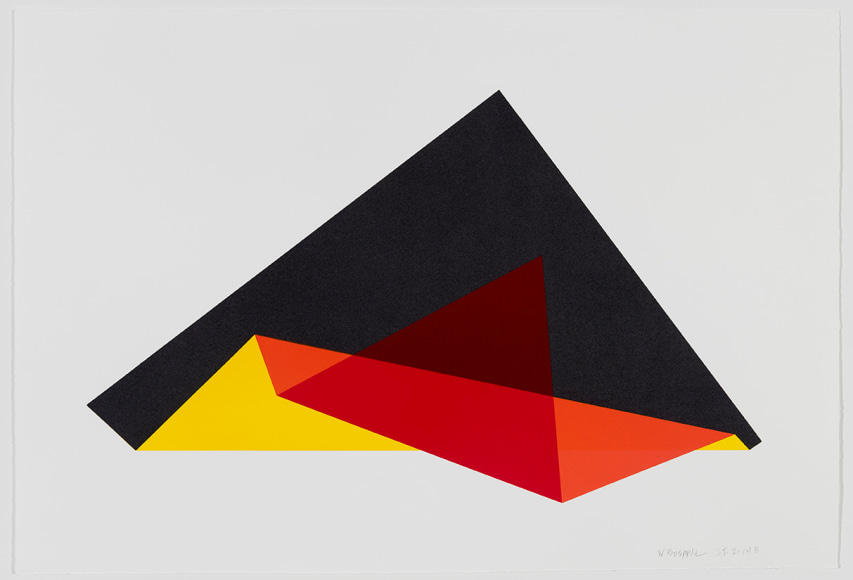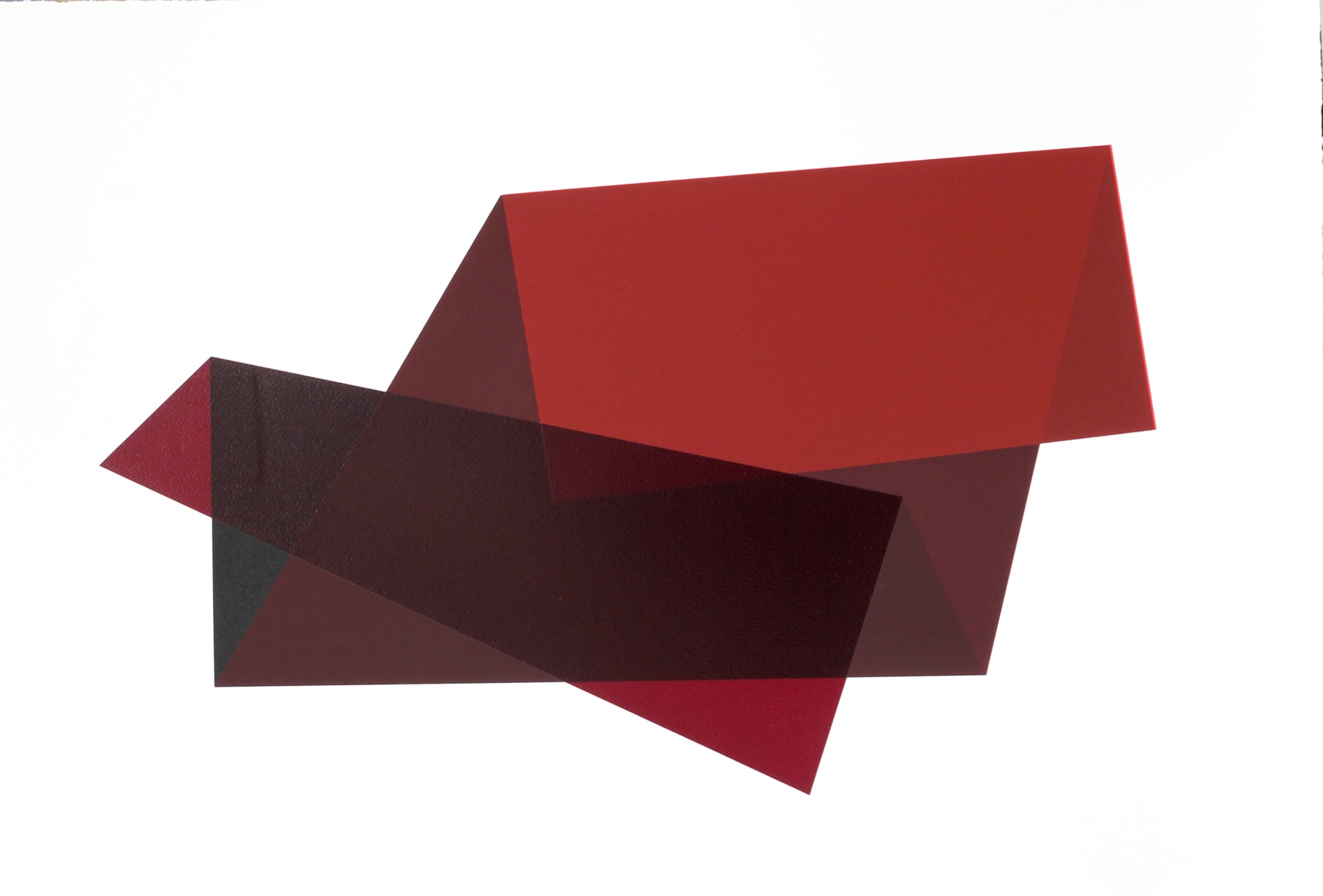 Boepple’s first monoprints, made with the master printer Kip Gresham in Cambridge, England were originally inspired by the artist’s resin sculptures. Layered shapes derived directly from the sculpture explored themes of layering and translucency. Over the last two years, Boepple’s imagery evolved into forms that fold over themselves, layering on one another, almost like origami. This theme developed a number of different formats that invite the viewer to draw associations to quotidian objects such as Band-Aids, envelopes, and tents.