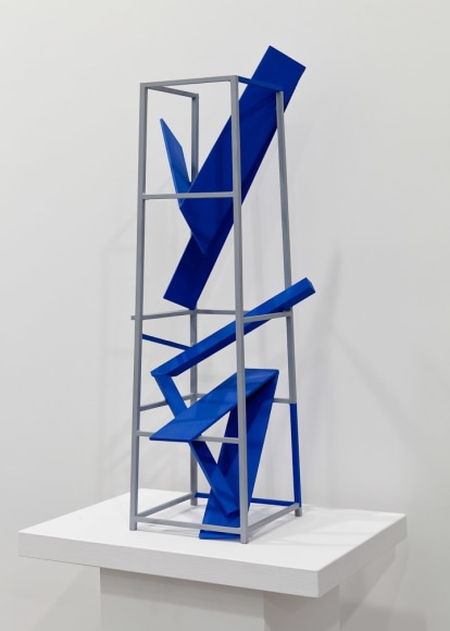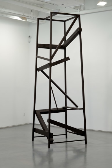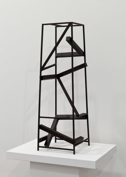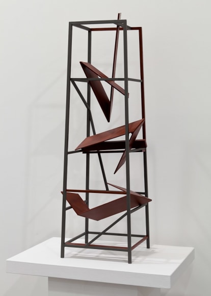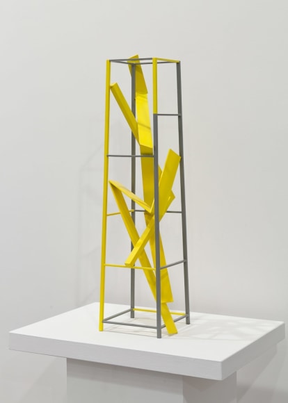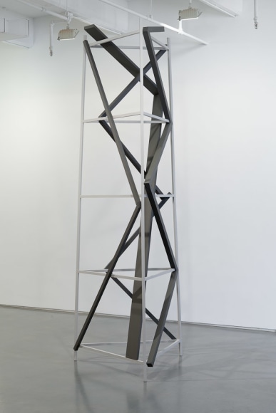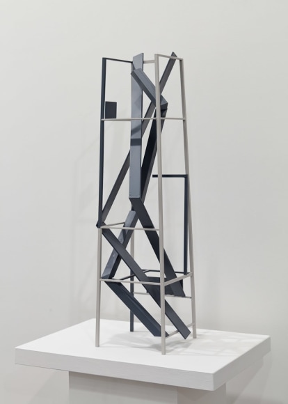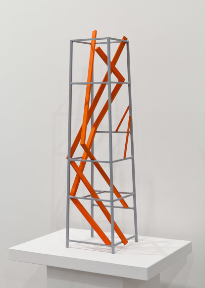 The works in this series embody an aesthetic paradox long-explored by the artist: the simultaneous evocation and denial of any object-reference. While they suggest the connotation of something familiar–with these, one may call to mind an array of architectural structures: scaffolding, the base of a water tower, or perhaps even playground equipment–ultimately, they are objects of mystery, which defy their own genesis. Boepple tackles the challenge of the specifically vertical structure, which inherently invites figurative interpretation despite being composed of abstract substrates.