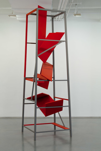 Writing about Boepple's "Loom" series, a smaller, horizontal precursor to the new works, David Cohen has said: "Free even of the possibility of literalism and certainly not readily associational, they leave the eye to do all the work."[1] Indeed, the towering structures unfold before the viewer, both as objects to be considered and as structures to frame and interact with their environment. Up close, they further surprise with their masterful craftsmanship: whether working in painted wood, aluminum or steel, the careful joining and welding of the elements is unexpected in a work of such scale.