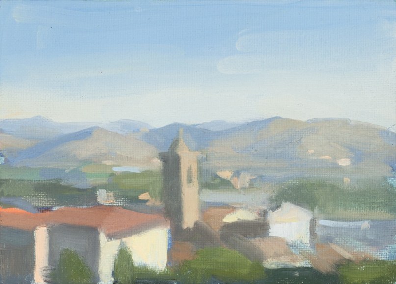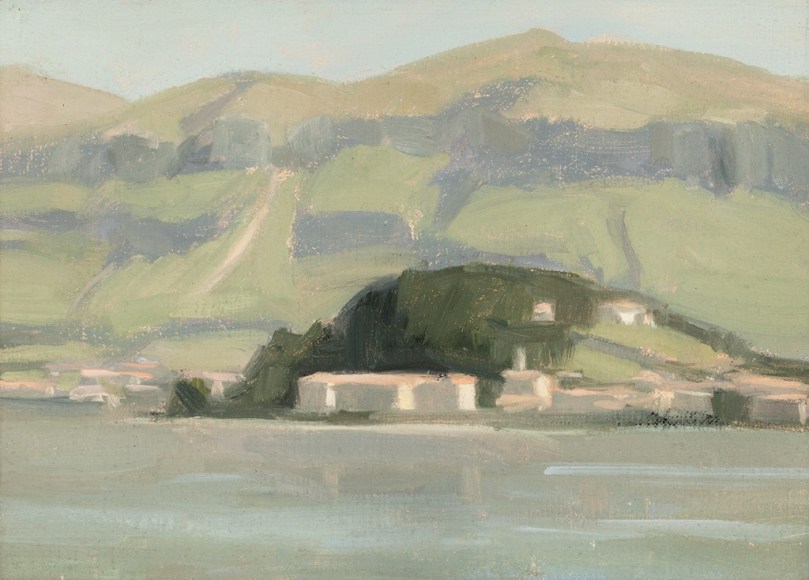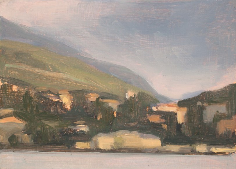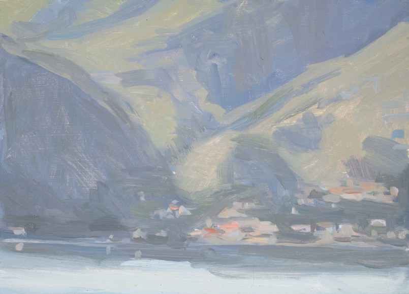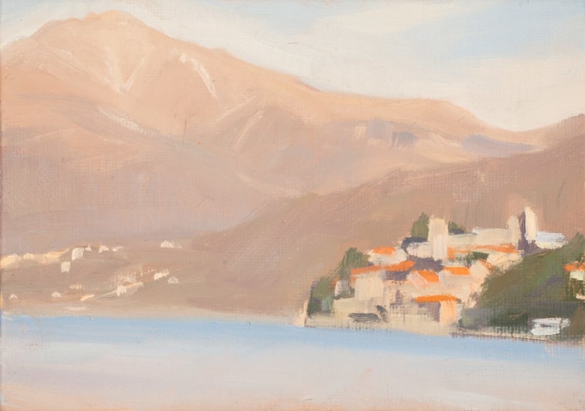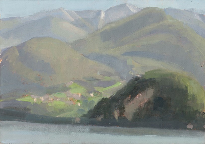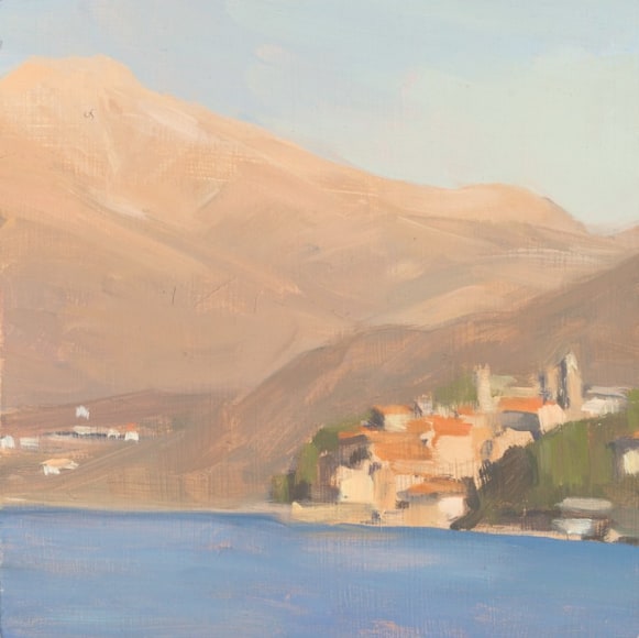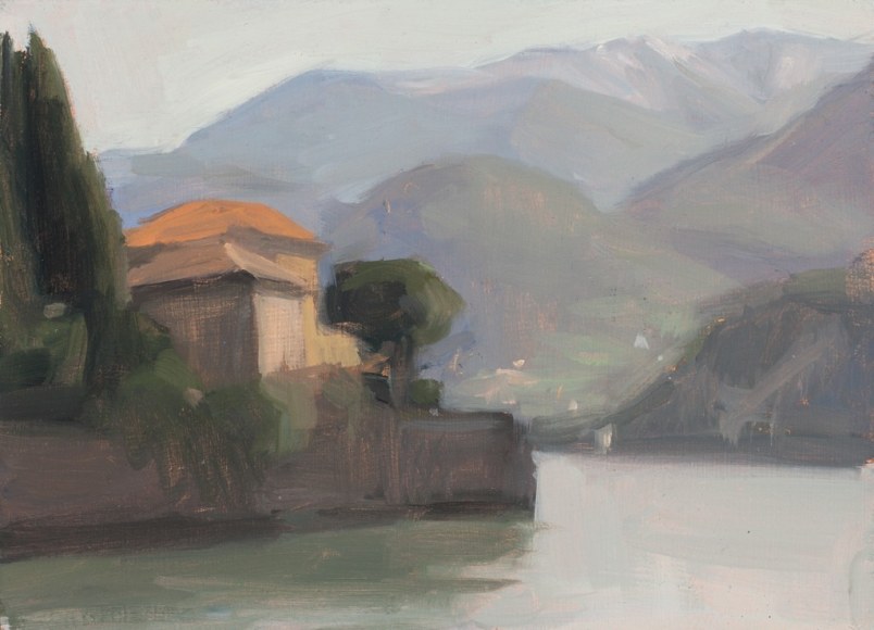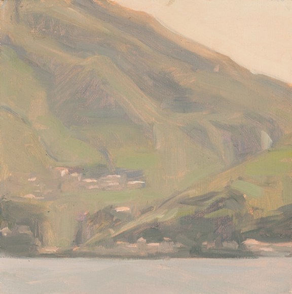 This exhibition will feature a series of small paintings depicting the landscape of and around Lake Como, Italy. Attempting to capture the changing light splashed across the lush Italian landscapes, Horowitz often paints en plein air. By carrying her small canvases (measuring only a few inches in each dimension) around with her she is able to chase the light that is so critical to her work. The effects she captures – reflections gleaming off the water’s surface, the sun’s rays filtering through the morning fog, or a dark shadow obscuring the side of a hill – are subtle, but lead to the creation of paintings that are both nuanced and carefully balanced. The artist creates the relaxed atmosphere of a lakeside retreat through her earthy palette and concentration on color.