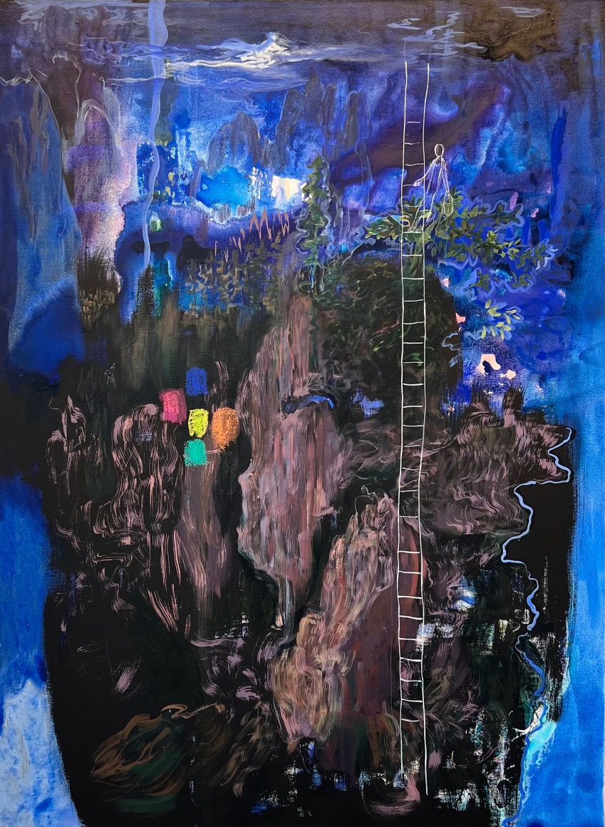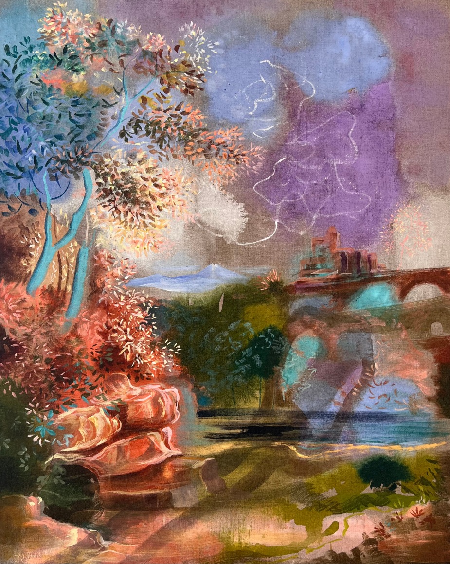 The paintings in this exhibition were all finished over the last year at the artist’s studio in Kinderhook, NY. There, overlooking an expansive meadow inhabited with wildlife, the artist combines her pastoral surroundings with references to ancient cultures that she absorbed during her many years living in Italy. In doing so, she combines her personal (and our collective) past with the present. A lifted background from a Thomas Cole landscape or a figure from a Giorgione painting are overlayed with colorful, sinewy abstractions and ghost-like figures. The resulting metaphysical compositions share an affinity with artists ranging from Charles Burchfield to David Salle and Peter Doig.