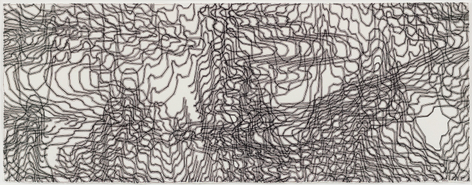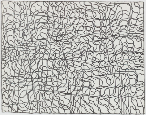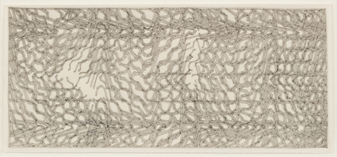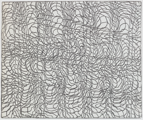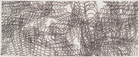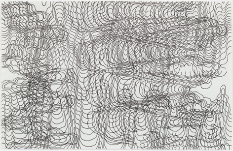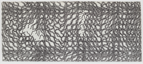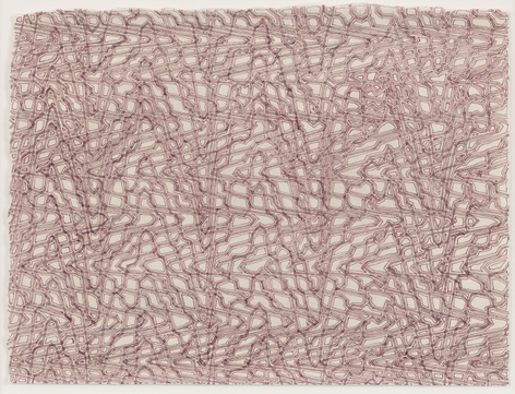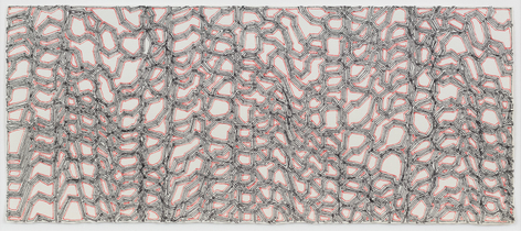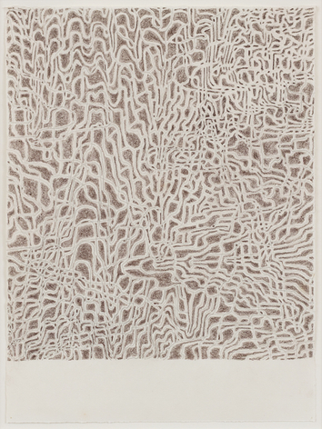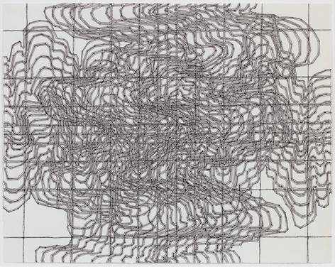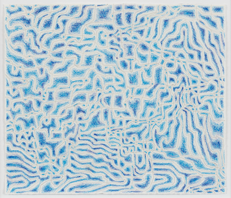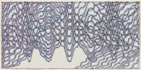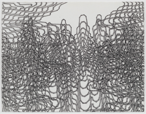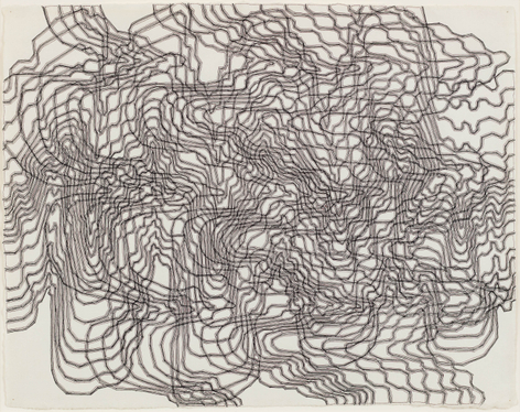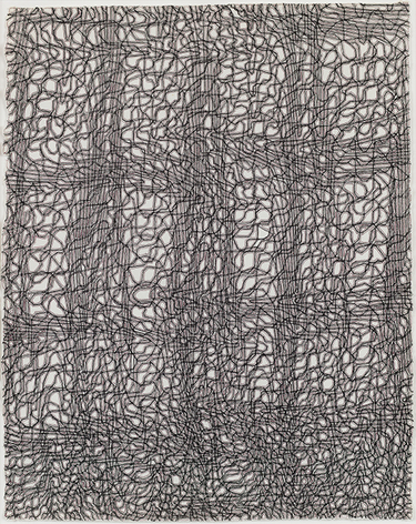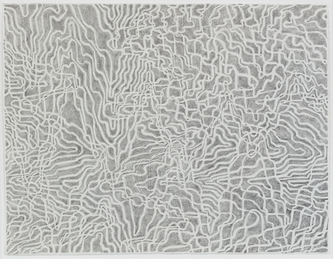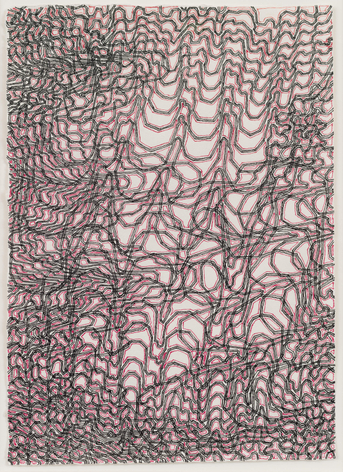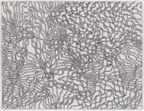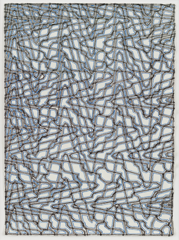 As with all works in Siena’s practice, these drawings were created with a system of self-imposed rules called “visual algorithms” that allow the artist to create these labyrinth-like structures. Starting with a sinuous line that undulates across the surface of the drawings, Siena often retraces and outlines his original composition with additional lines of varying thickness and color. For some drawings, including Tubular Bells and Zabian’s, the artist uses a light table and templates made of museum board. The result is a mesmerizing network of lines that call to mind such associations as neural synapses, topographic maps and lace fabrics.
