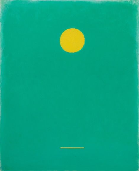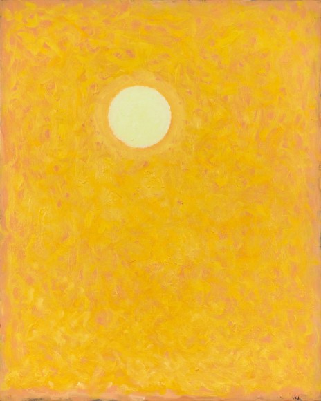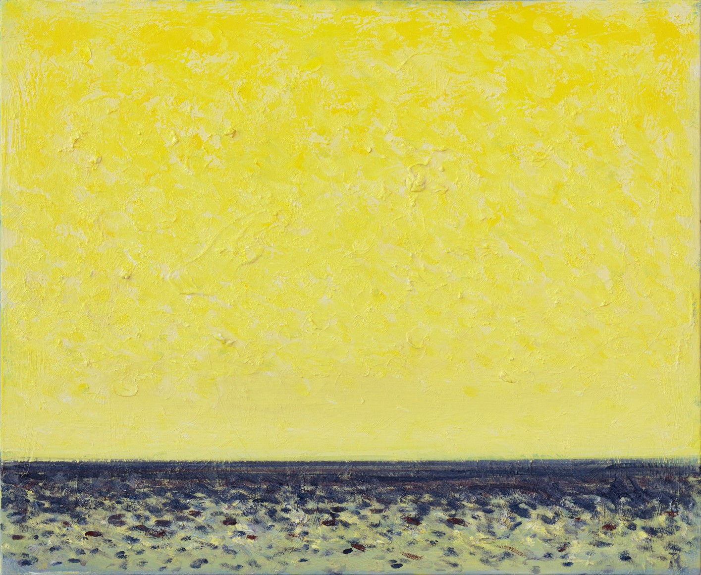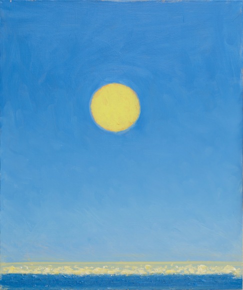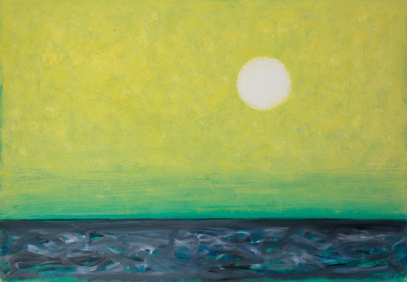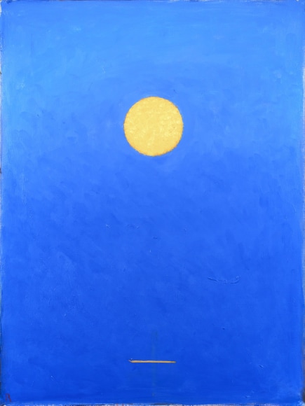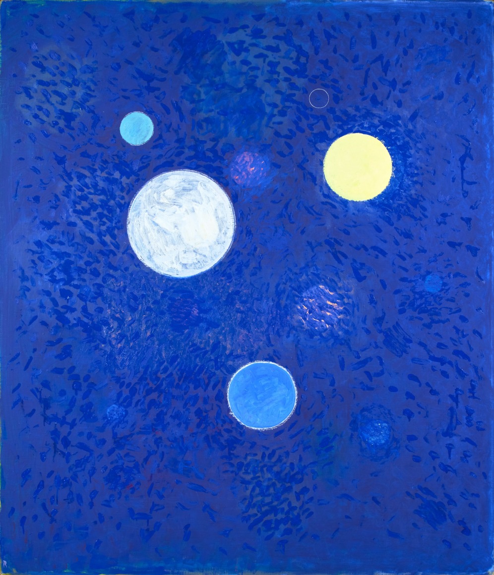 This exhibition will be comprised of eight recent paintings finished over the last year. The compositions in these works continue to build-on, or rather remove-from, the artist’s “End of Day” series, which depicted pared-down sunsets over the ocean horizon. This series is even more minimal. The canvases are predominantly empty, painted in single hues ranging from terra-cotta to cerulean to goldenrod and executed in passes of rhythmic brushwork. Sometimes there is a single circle, signifying the moon, sometimes not. A few canvases also delineate the horizon with a single, abbreviated line. One painting, Cobalt Galaxy, is the largest in the show and measures 75 x 65 inches; it features many orbs and circles and calls to mind the artist’s “Ponds” series from 2010.