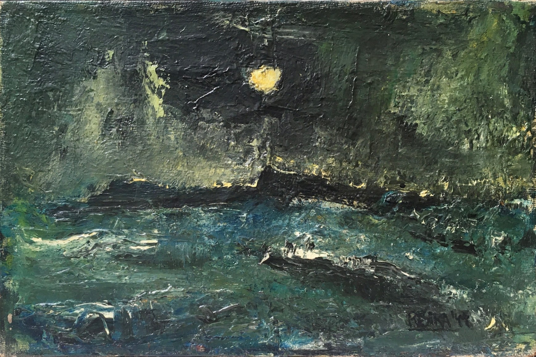 In the second gallery, there are two pictures. End of Day #12 is the largest of that series and painted by Resika last year at the age of 95. The foreground of the composition is dominated by an imposing black sea that gives way to an acid-green horizon. A sun hangs low in the chartreuse-colored sky. The second picture, Moonlight, was painted between 1943-44 and finished when Resika was only sixteen years old. Though diminutive in size – it measures only 8 x 12 inches – it can be seen as a mysterious harbinger for the great artistic career that laid ahead of the artist at that time. And now, eight decades later, as it hangs across from the haunting End of Day #12, it serves as both a pendant and definitive testament to the incredible artist legacy Resika has forged.