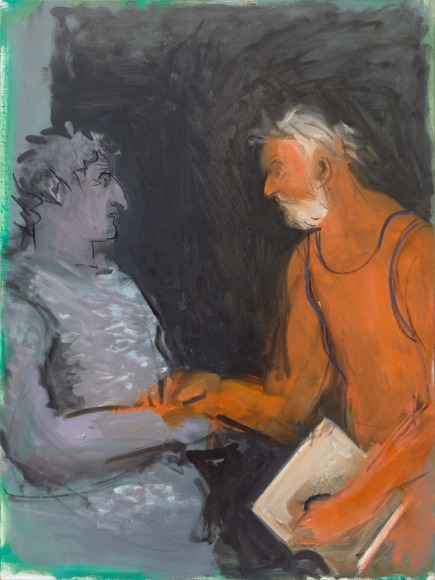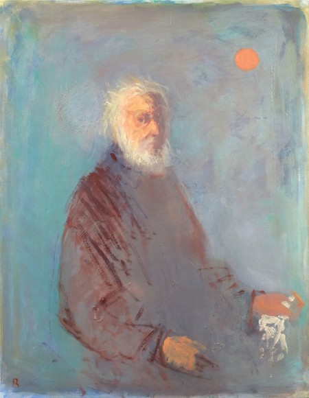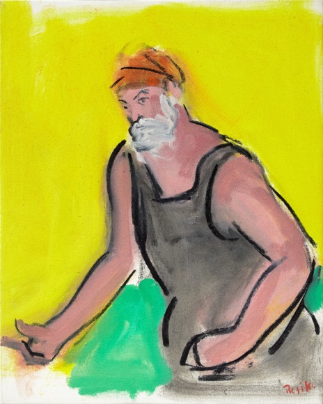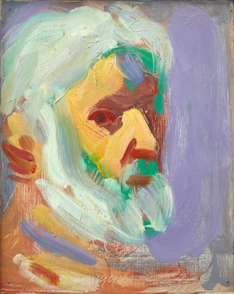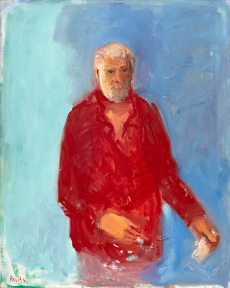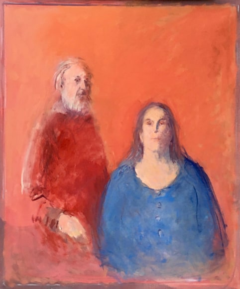 "[Paul Resika’s self-portraits] portray a man looking at and painting himself between the ages of eighteen and ninety-three. In the earliest self-portrait, 1946, the adolescent Resika bristles with energy. His huge, dark, Pantocrator eyes bore into the viewer as if we, the onlooker, might hold the secret to life (or as if he himself holds that secret and doesn’t want us to mess with it). Seventy-five years later, in Double-Portrait, 2021, the white-haired, white-bearded Resika, accompanied by his wife, my sister Blair, the artist’s youthful energy has waned. Now the energy is not in the artist’s figure, but rather in the painting’s colors, textures, and shapes. Just as the semi-abstract boats in Resika’s rollicking boat paintings float in a sea of blue (or green or yellow or orange), in this double portrait, Blair and Paul’s highly simplified forms float in a sea of red-orange. This image of Paul at ninety-three has none of the assertive physical presence seen in earlier paintings. Instead, he has a quiet inner-looking energy that contemplates the present and reflects upon the past." [1]