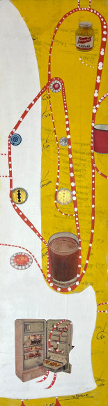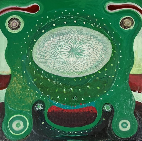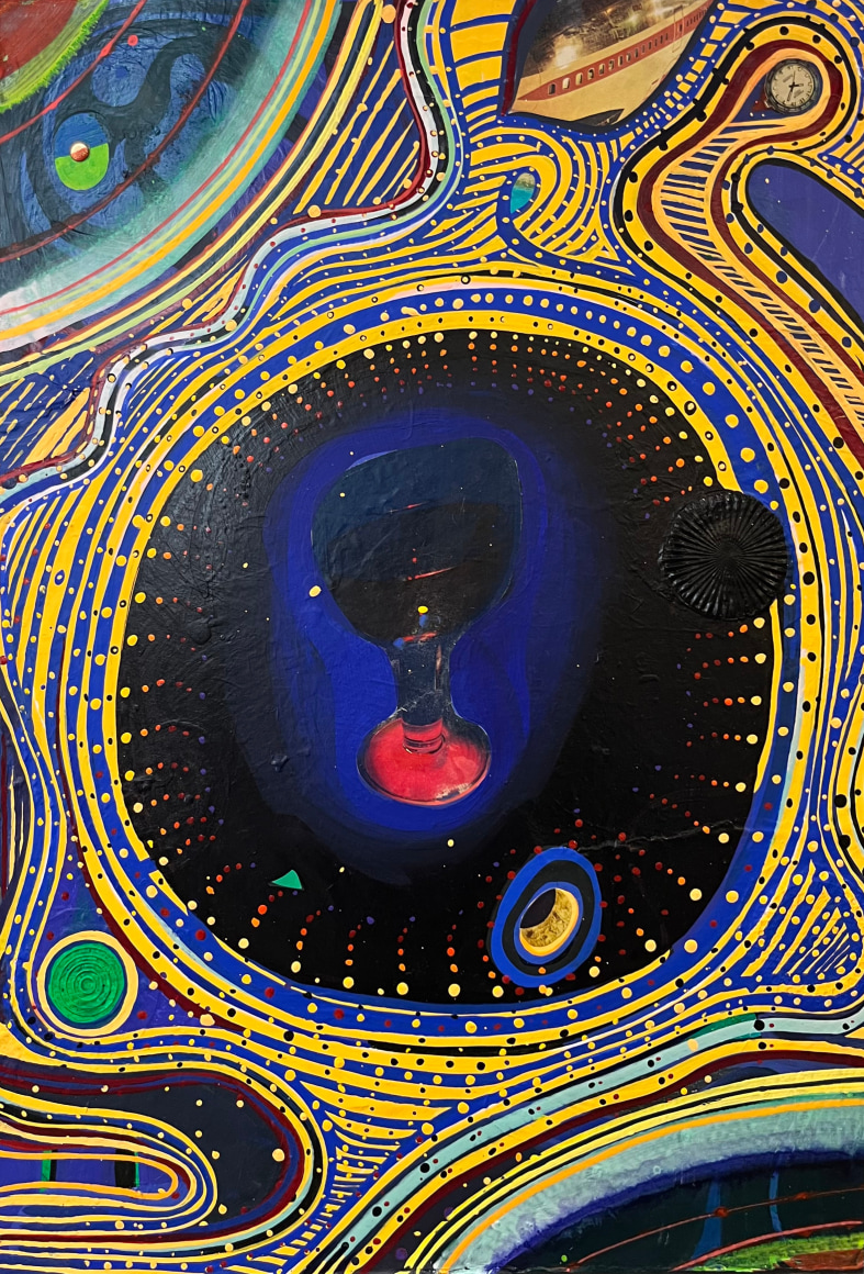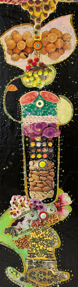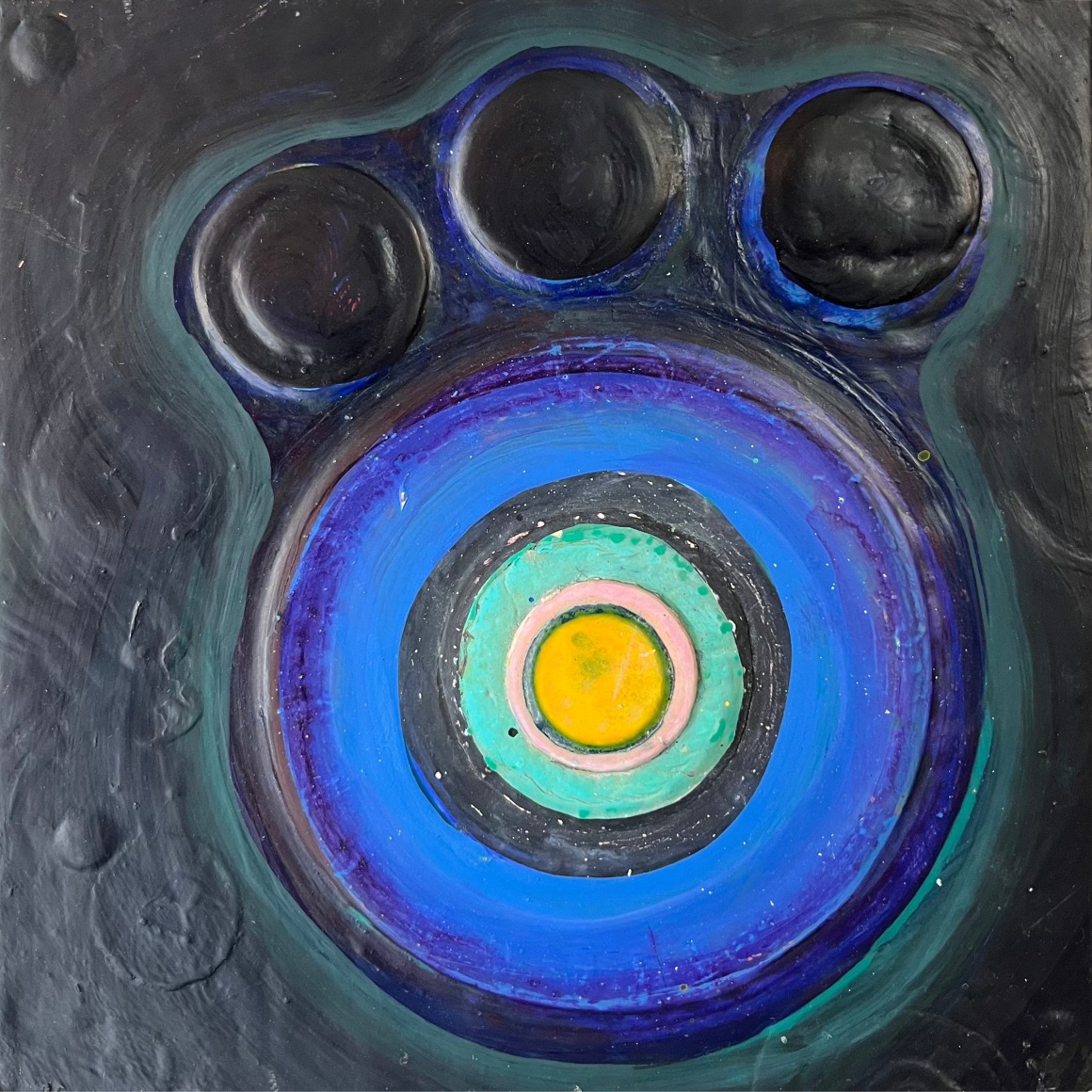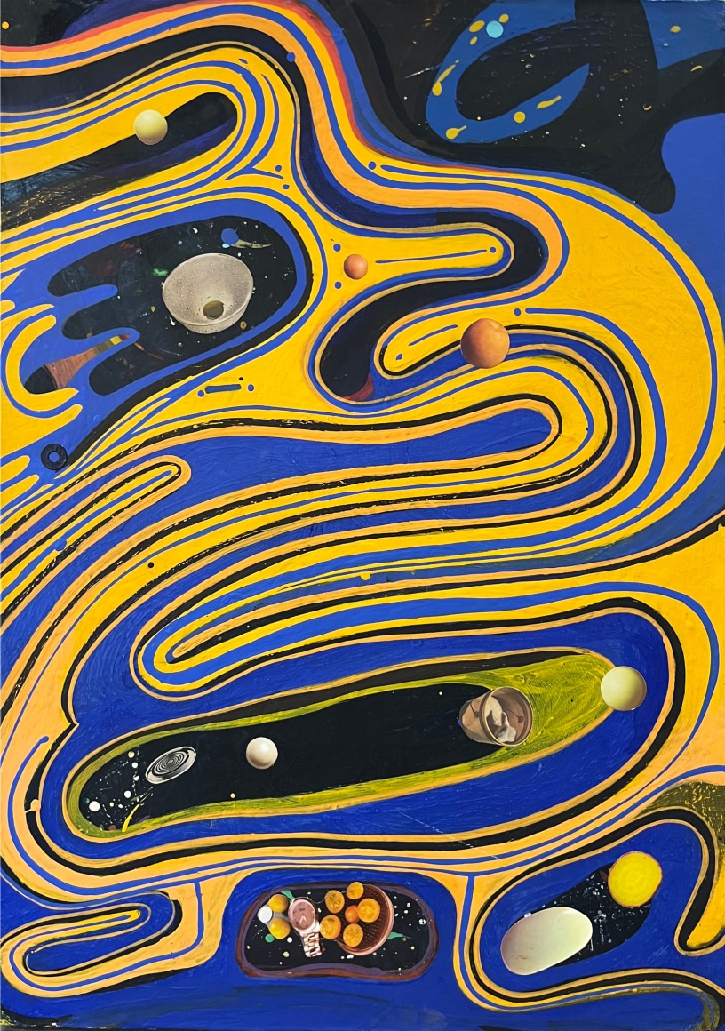 Horvath’s paintings contain the stuff of everyday life. Her common materials connect with the uncommonness that exists in all things. In one painting, I inspect a mandala: Is it a collaged photograph of a cupcake that has been cut from a magazine? In another painting, an embedded circular object appears like a radiant form in an Emma Kunz drawing or Hilma af Klint painting. Is it a manifestation of the sacred geometry of the universe, or a piece of plastic packing material? I see that it is both and rejoice in the realization that my kitchen recycling bin is filled with sacred presence.