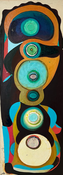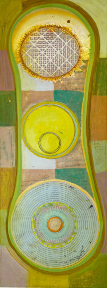 An arrangement of shapes, images and physical objects sit on the painting’s surface or embedded inside it. The objects, which may be immersed in the aqueous painted gestures or framed by compositional bubbles, appear as votive offerings. They are placed like food, coins, writings on clay fragments, or small statuary to be offered on an altar, cast into the water, or deposited in the ashes of a sacrifice.