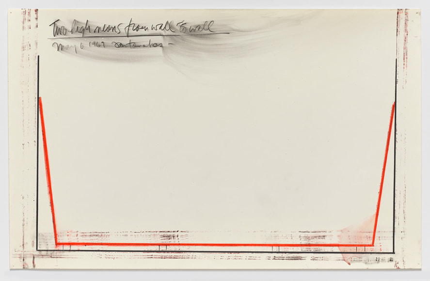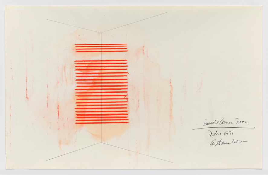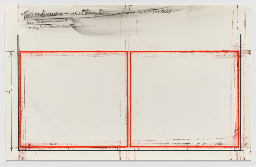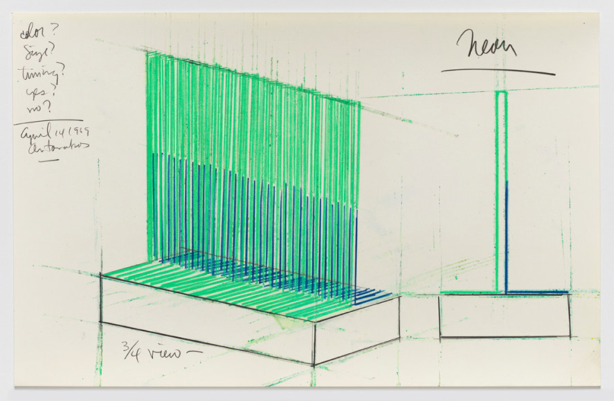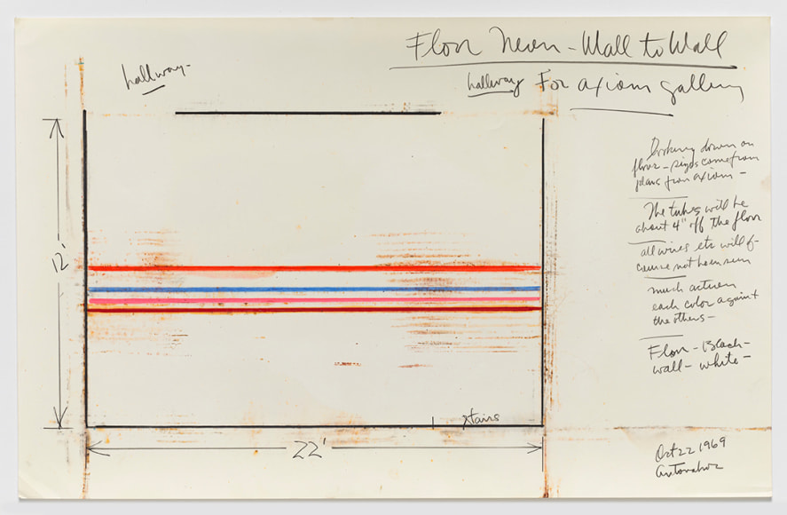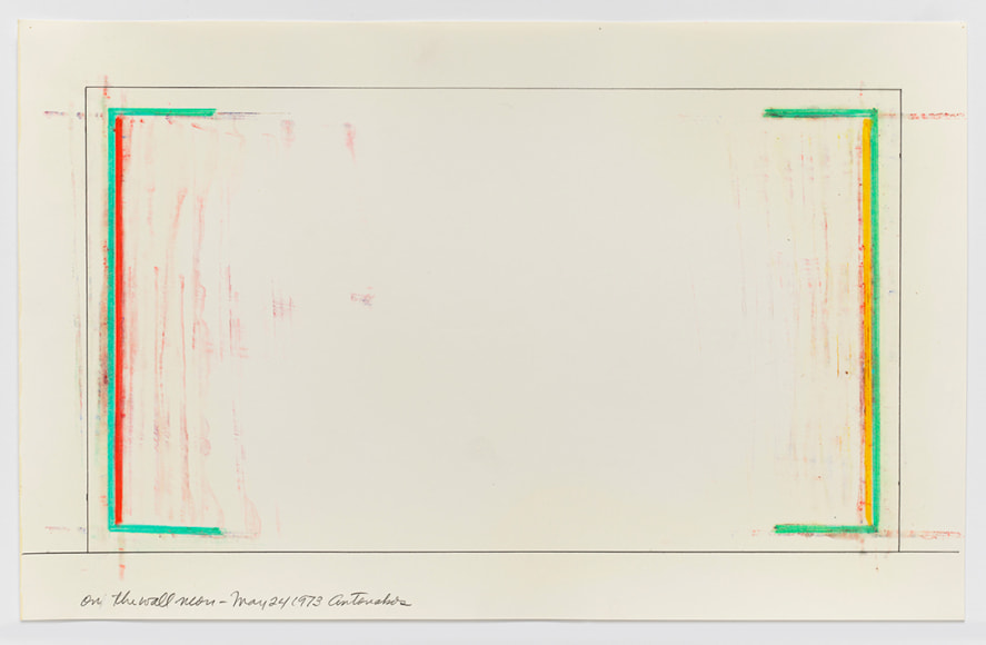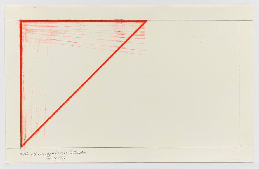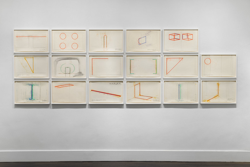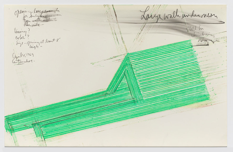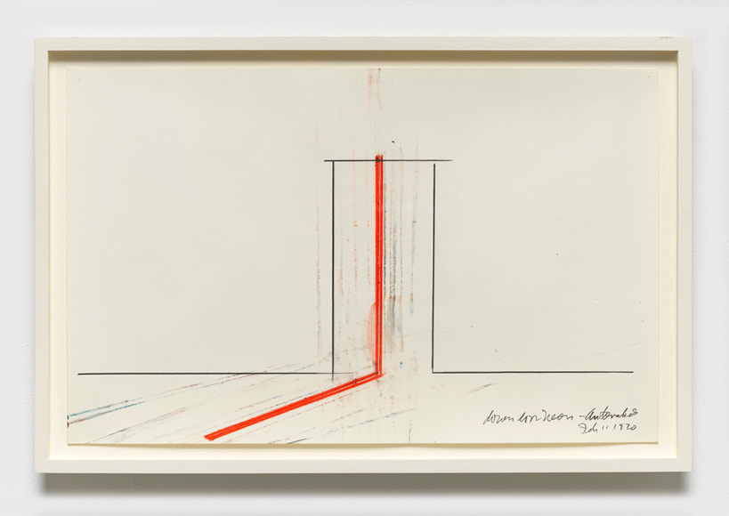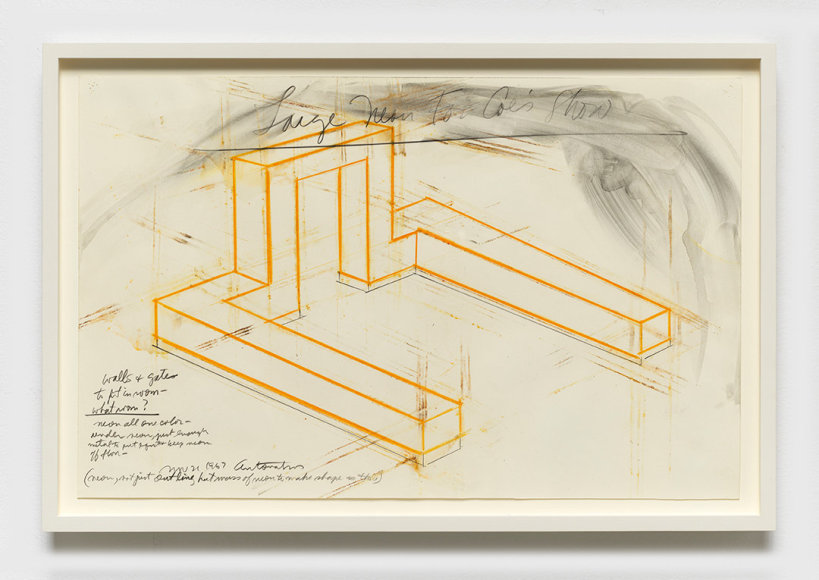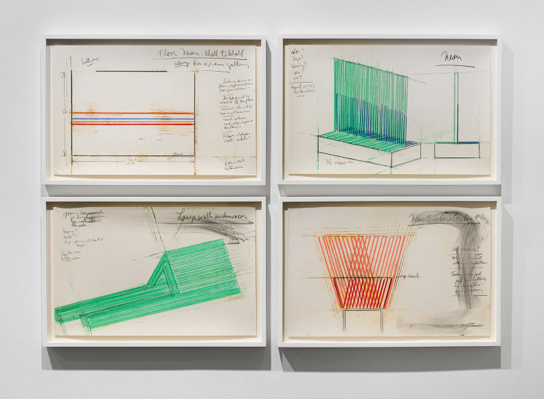 The exhibition offers approximately 50 Project Drawings and one model for a red and yellow Neon Wall from c. 1967.