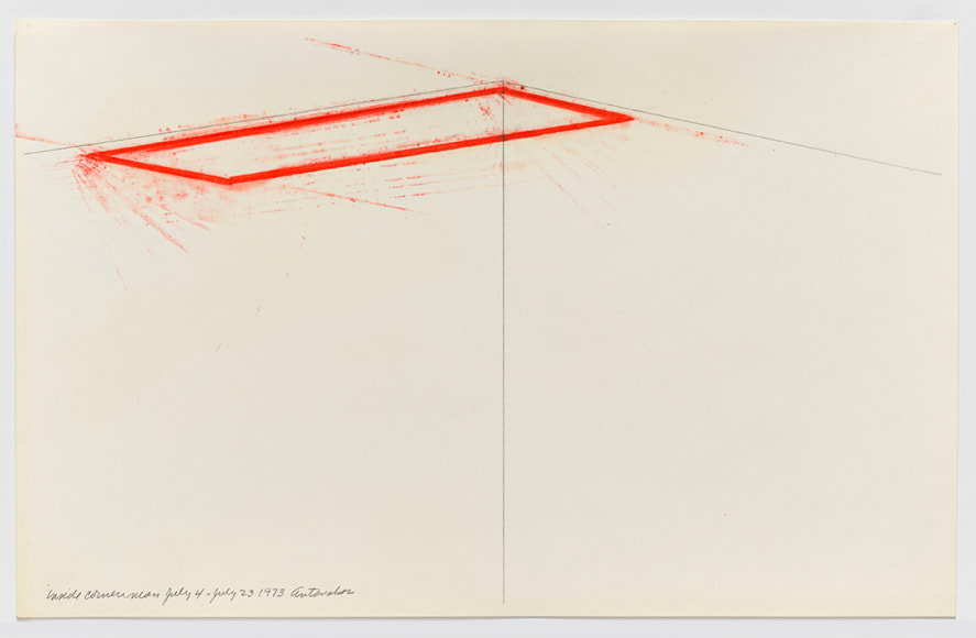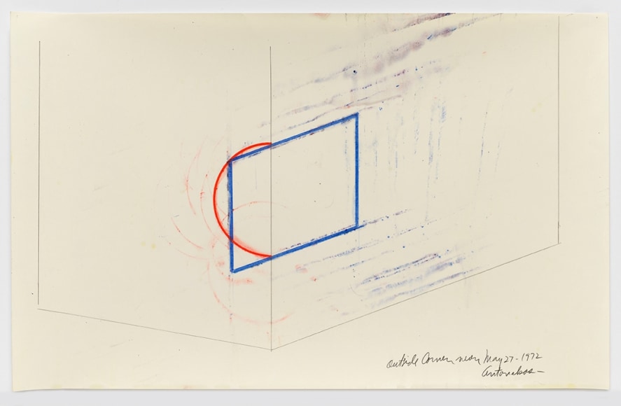 At first, we see vivid images for neon geometries on bases, with impatient notes and questions written to the side of the image. These soon developed into proposals defined by their walls, inside and outside corners, and other architectural configurations. These become increasingly declarative, especially as to the importance of placement — the definitive relationship between the work and the site.