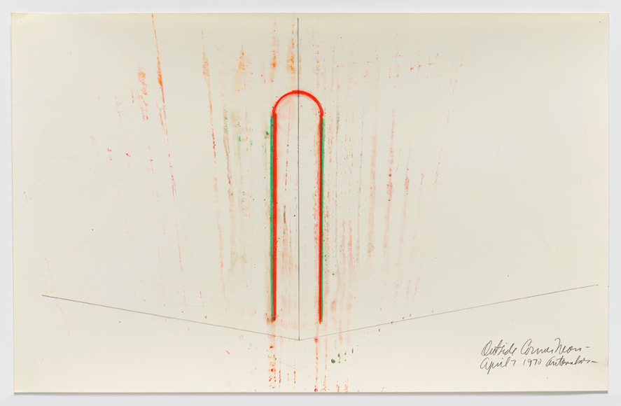 Since it was possible to realize only a few of his great rush of ideas in full-scale neon, Antonakos made exquisite intricate scale models – dozens of them. Even this was too slow a practice to capture the many urgent images flooding his mind. Only drawing rapidly in graphite and colored pencil would enable him to capture the great sequence of individual compositions that document the formal evolution of his neon work from 1965 to 1973.
