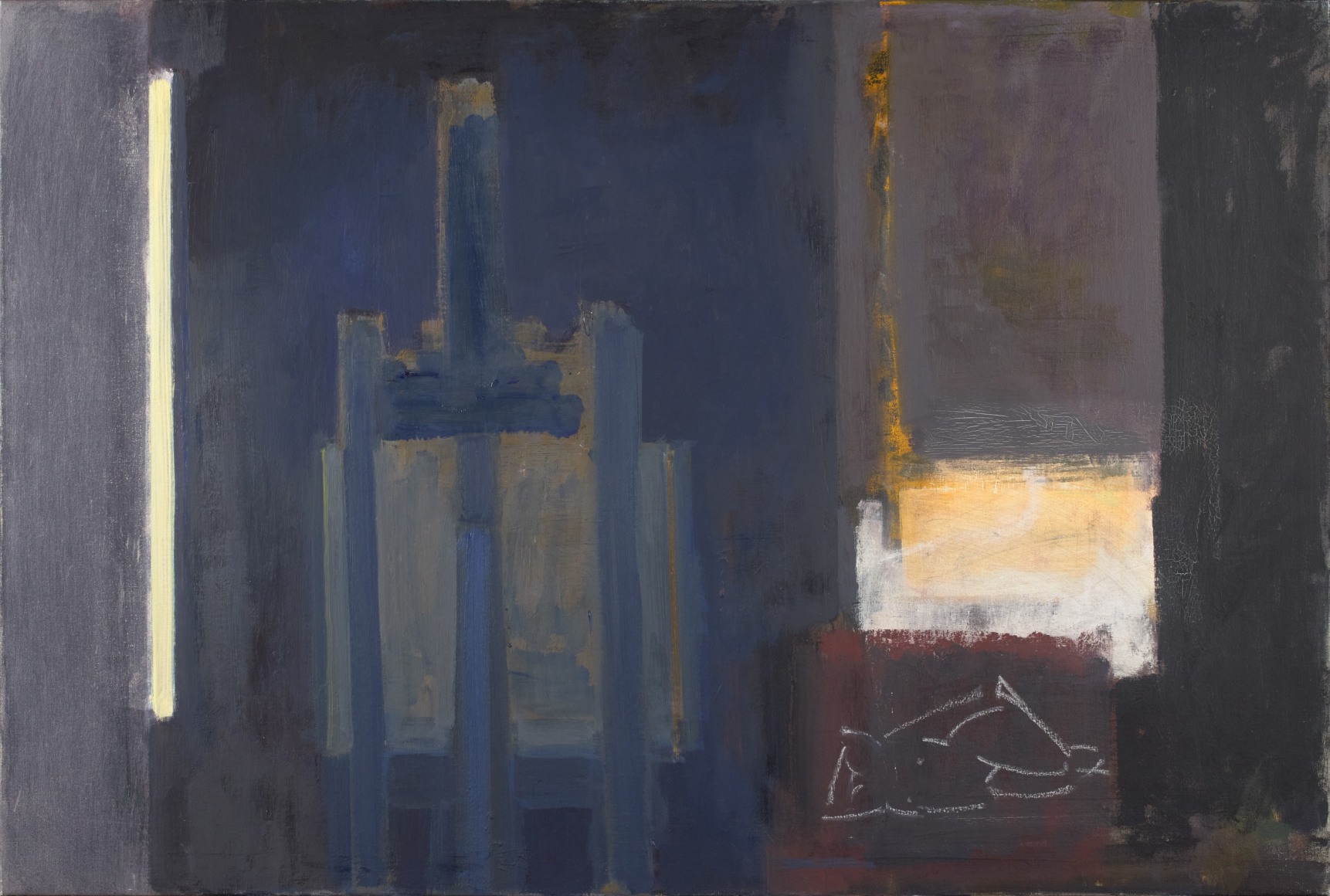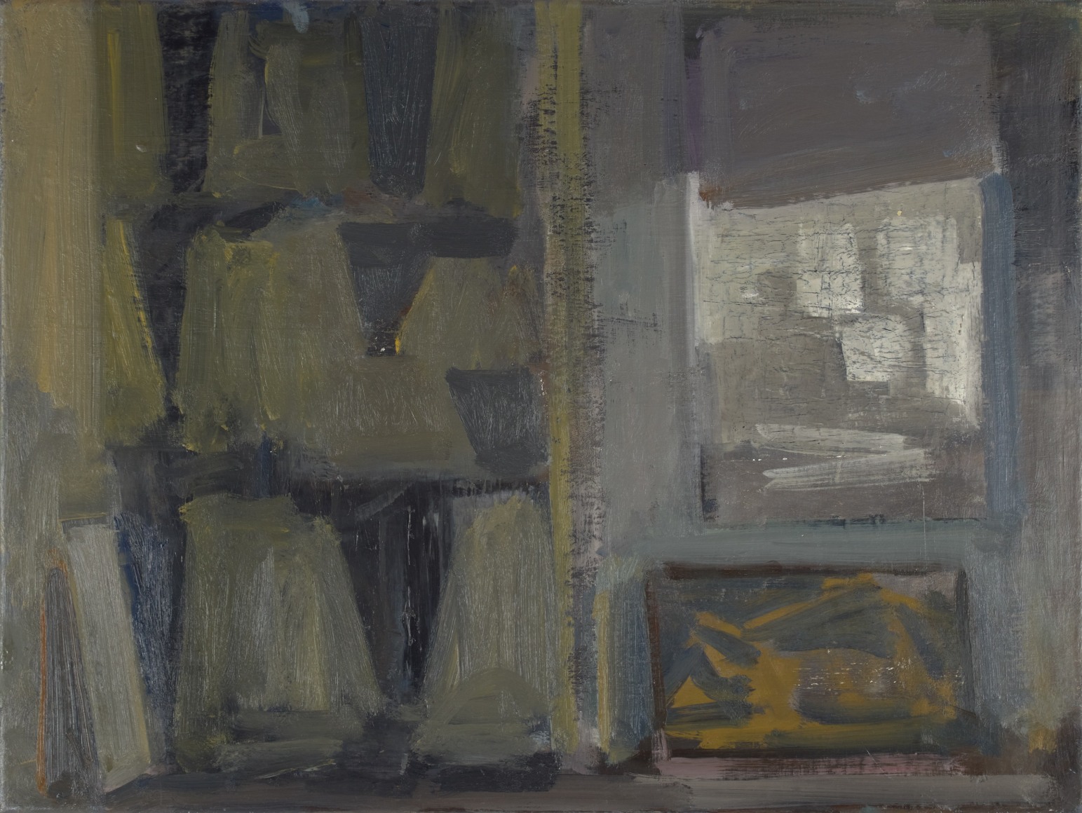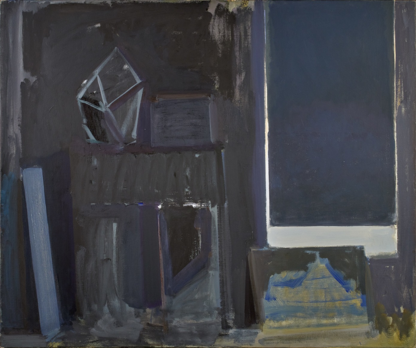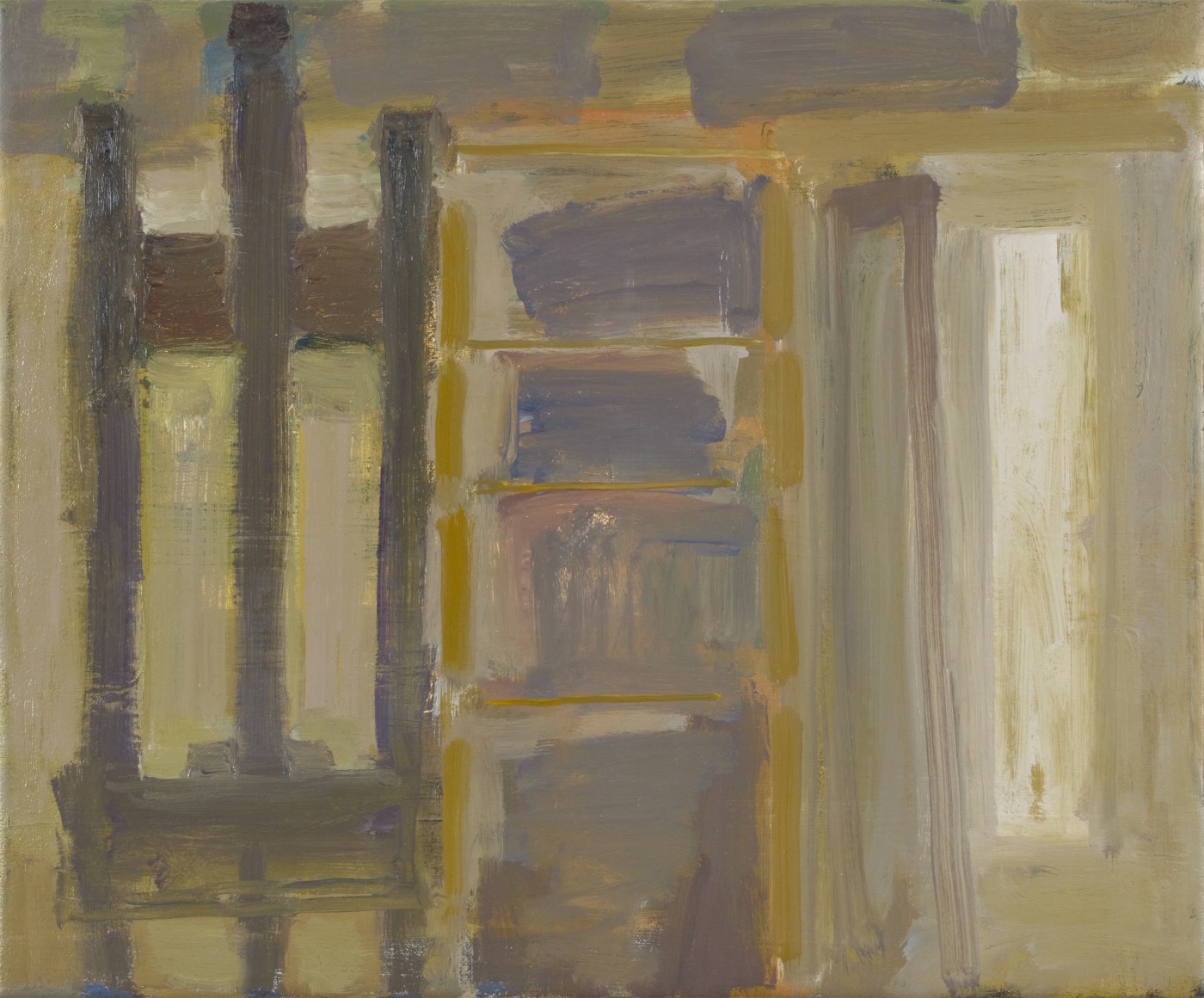 The subject matter of these paintings is a continuation of the theme from the artist’s last exhibition, which depicts painting racks in a studio storeroom. The works in the current show include the same interior but with the addition of elements from even earlier pictures, such as a polyhedral sculpture by Howard Kalish, an easel, a cityscape seen through an open window and a figurative painting propped against the wall.