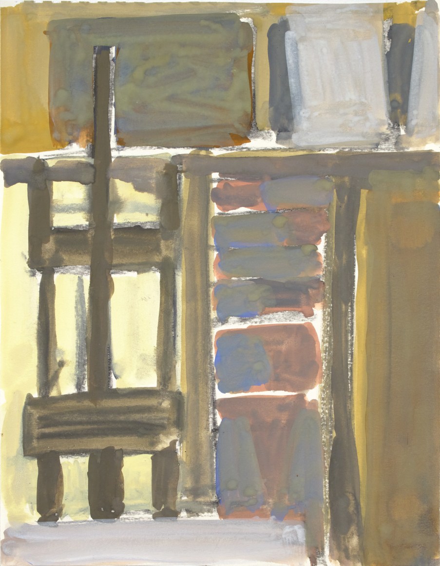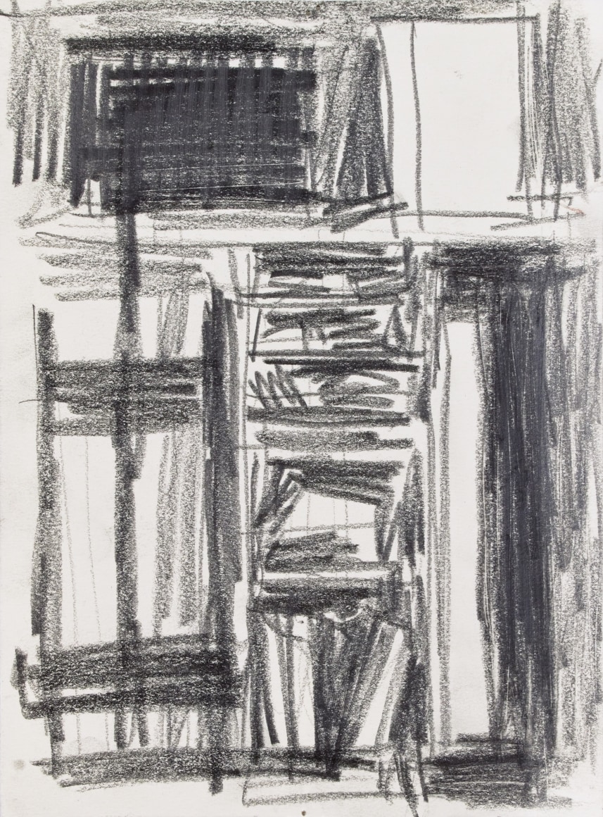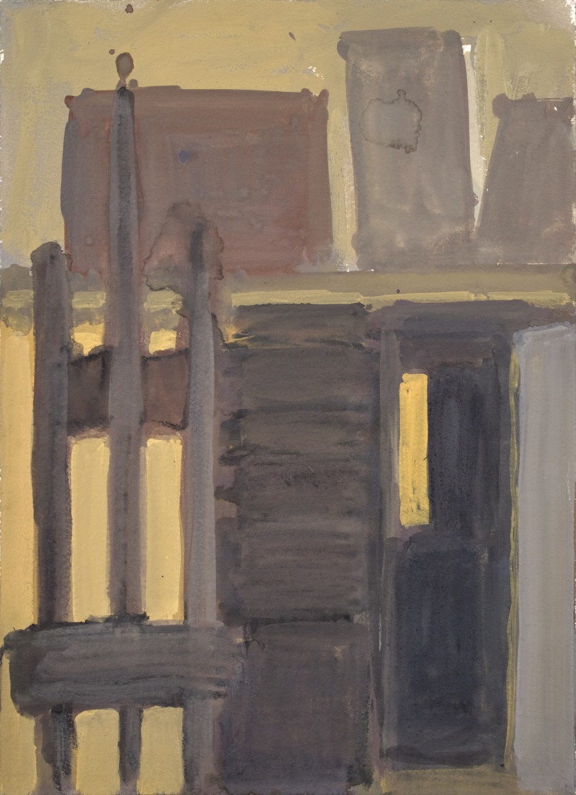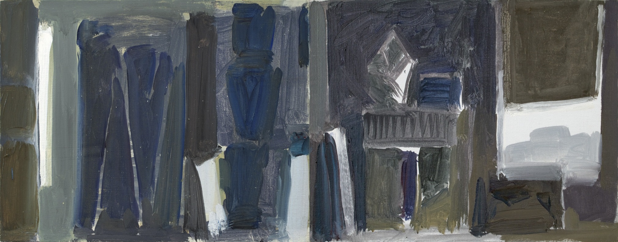 The subject matter of these paintings is a continuation of the theme from the artist’s last exhibition, which depicts painting racks in a studio storeroom. The works in the current show include the same interior but with the addition of elements from even earlier pictures, such as a polyhedral sculpture by Howard Kalish, an easel, a cityscape seen through an open window and a figurative painting propped against the wall.