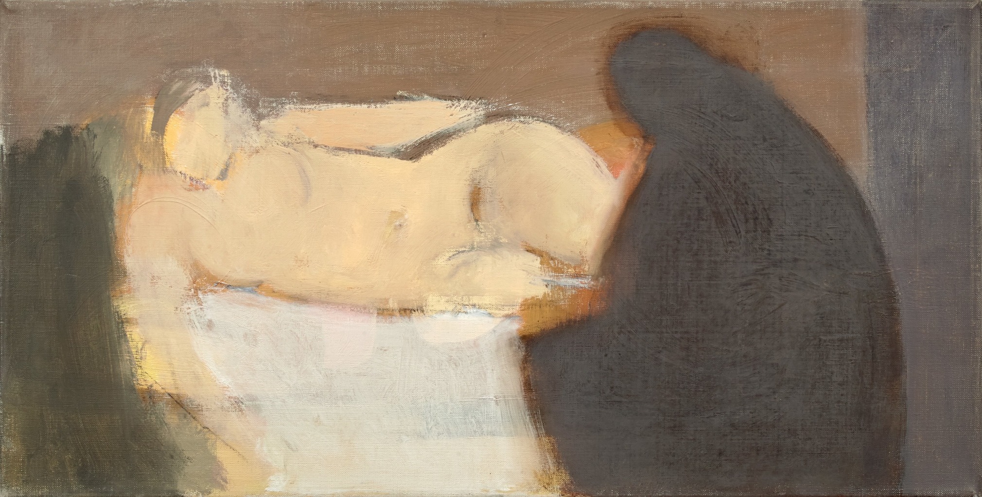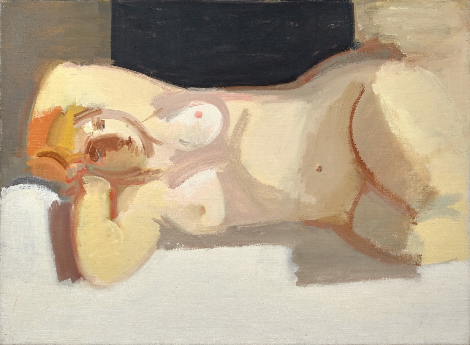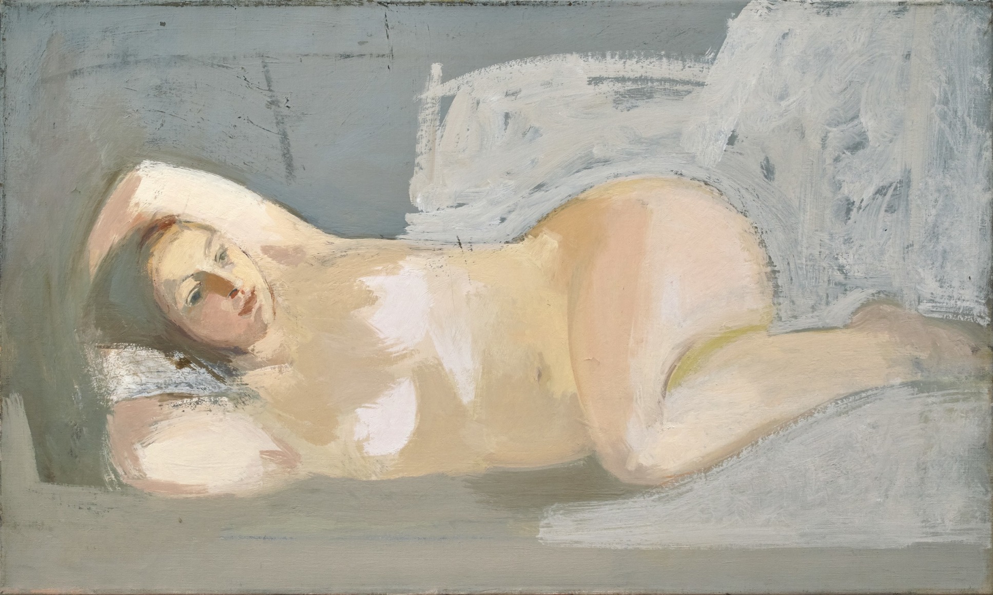 For the next eight years, Allison came to the studio roughly once a week. Their deepening trust and friendship was reflected in Phillips’ treatment of the subject, moving from early compositions which considered the figure – clothed - as a type of still life, to horizontal nudes in the tradition of the odalisque.